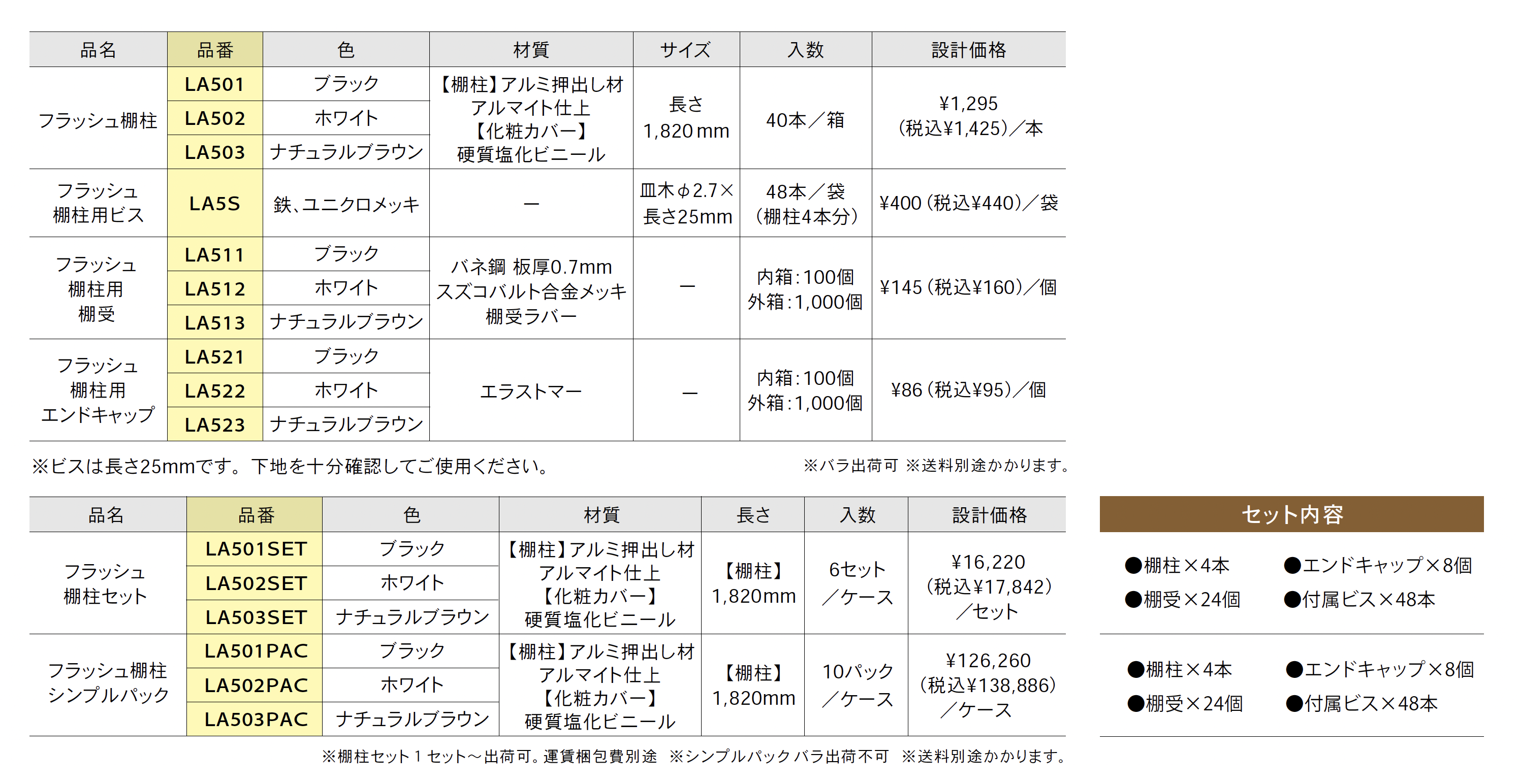 | 材質 | アルミ押出し材・アルマイト仕上 硬質塩化ビニール バネ鋼 板厚0.7㎜ スズコバルト合金メッキ 棚受ラバー エラストマー |
