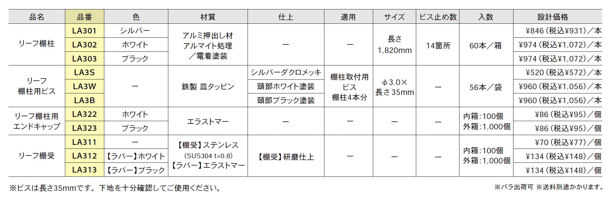| 材質 | アルミ押出し材・アルマイト処理/電着塗装 鉄製 皿タッピン エラストマー ステンレス(SUS304 t=0.8) |