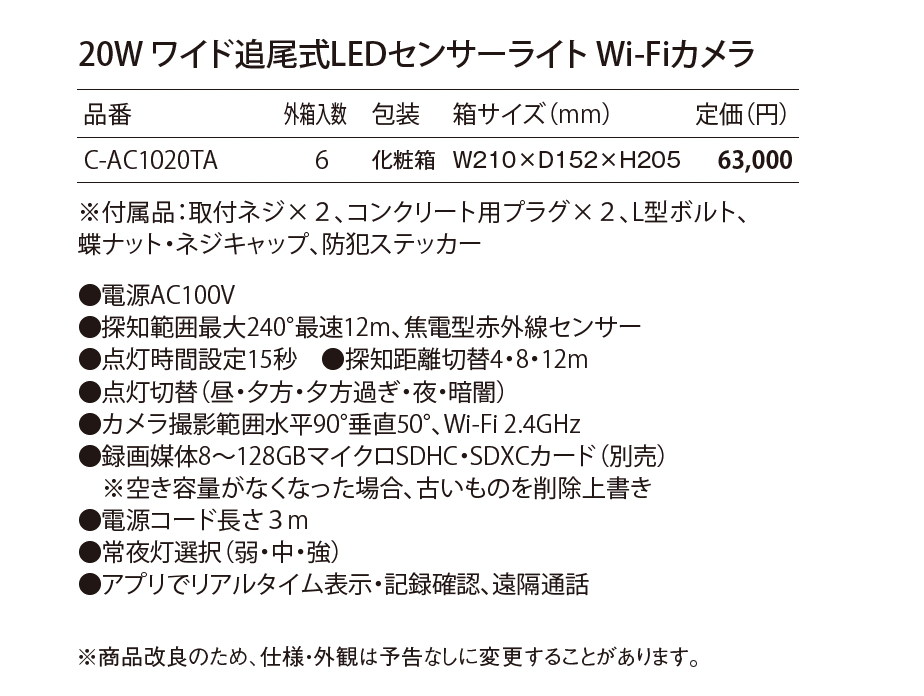 ワイド追尾式 LEDセンサーライト Wi-Fi カメラ(コンセント式)