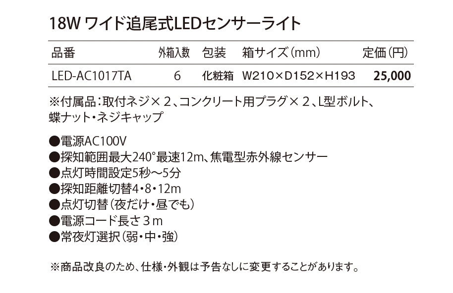 ワイド追尾式 LEDセンサーライト(コンセント式)