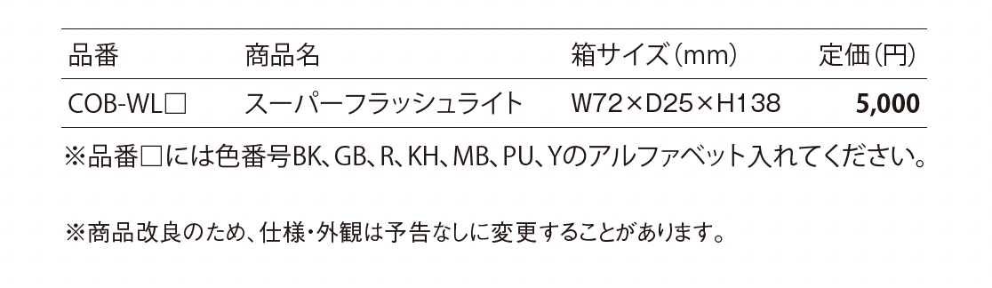 カラー | BK:ブラック GB:グレーイシュブルー R:レッド KH:カーキー MB:マリンブルー PU:パープル Y:イエロー |