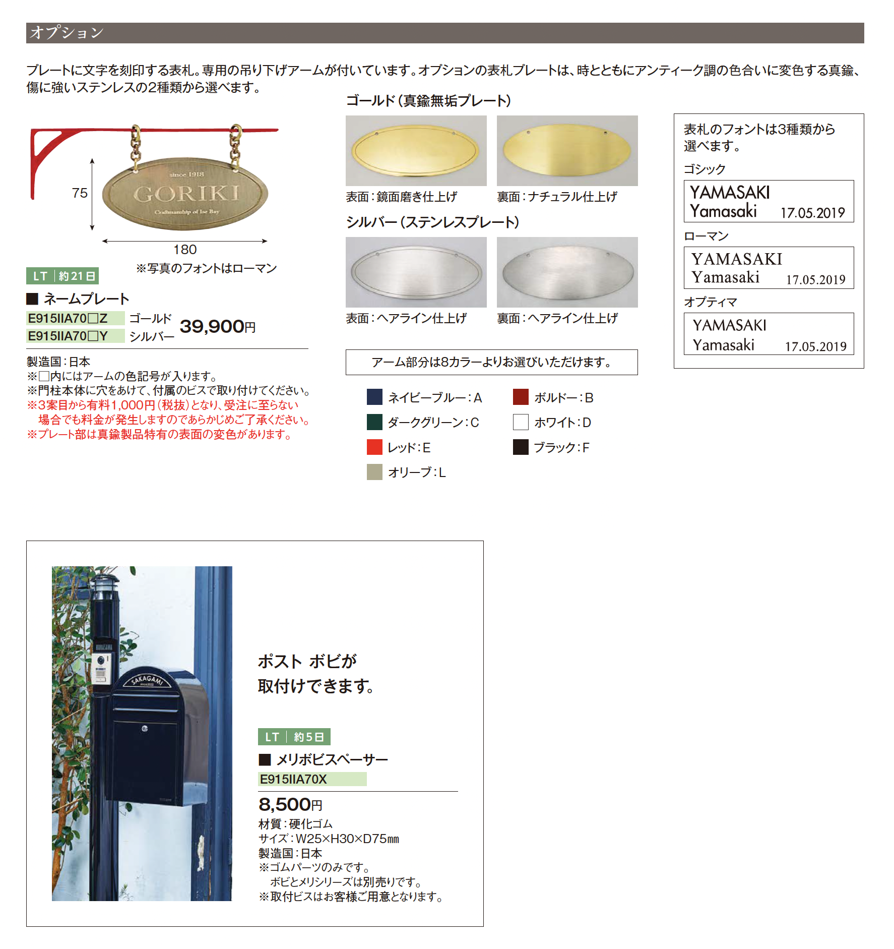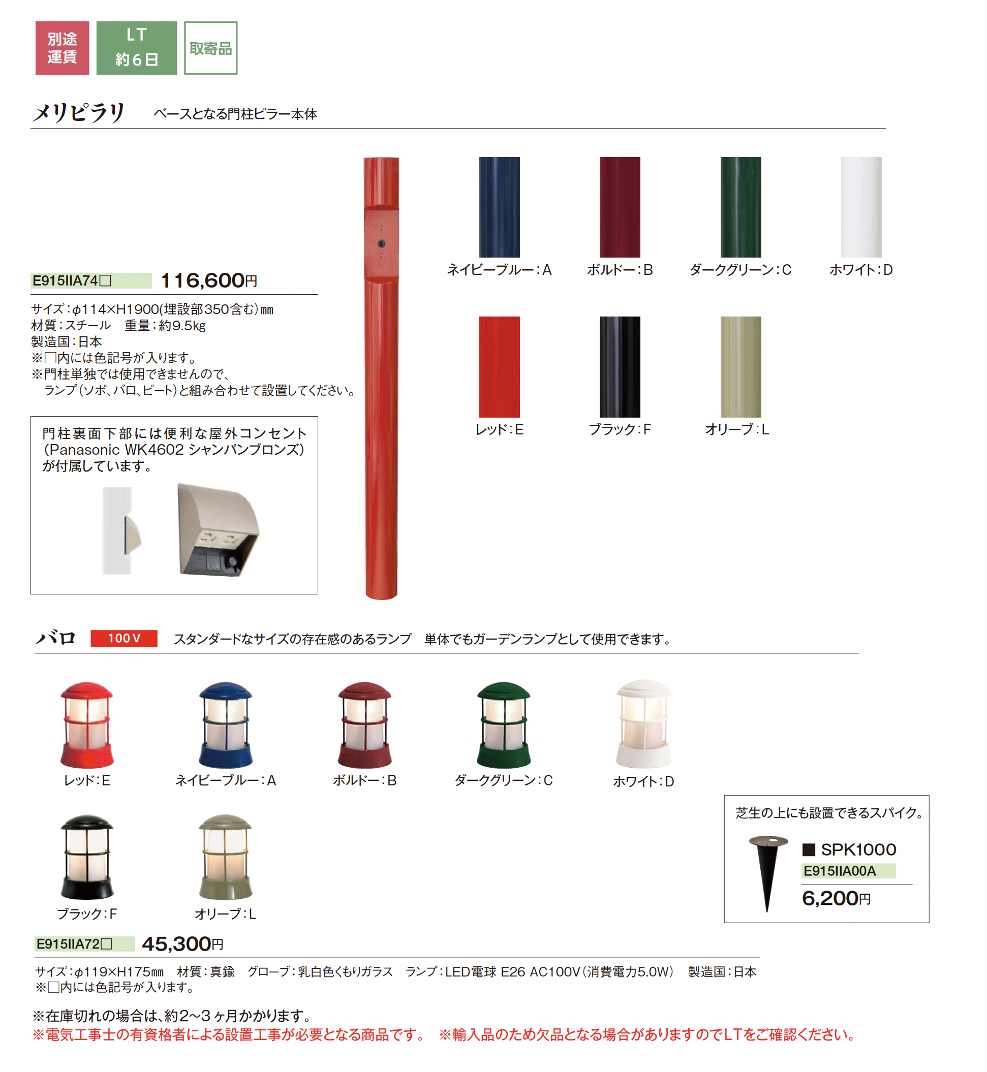 | カラー | E:レッド A:ネイビーブルー B:ボルドー C:ダークグリーン D:ホワイト F:ブラック L:オリーブ 電球色 |