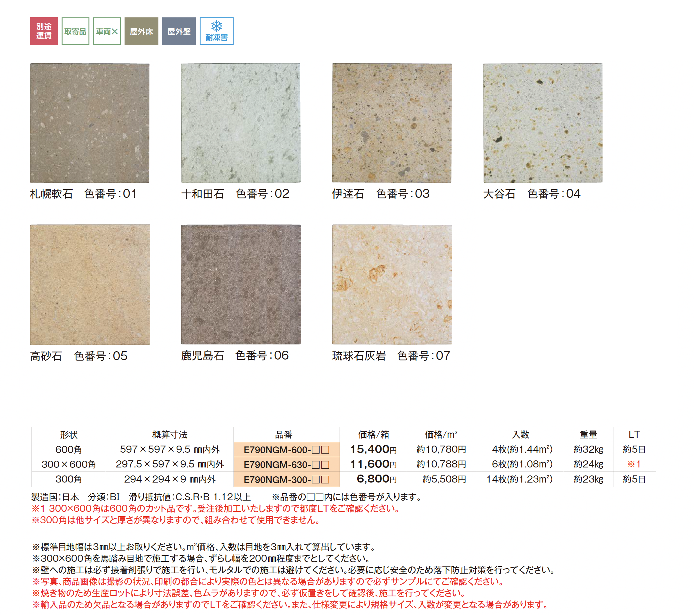 | カラー | 01:札幌軟石 02:十和田石 03:伊達石 04:大谷石 05:高砂石 06:鹿児島石 07:琉球石灰岩 |