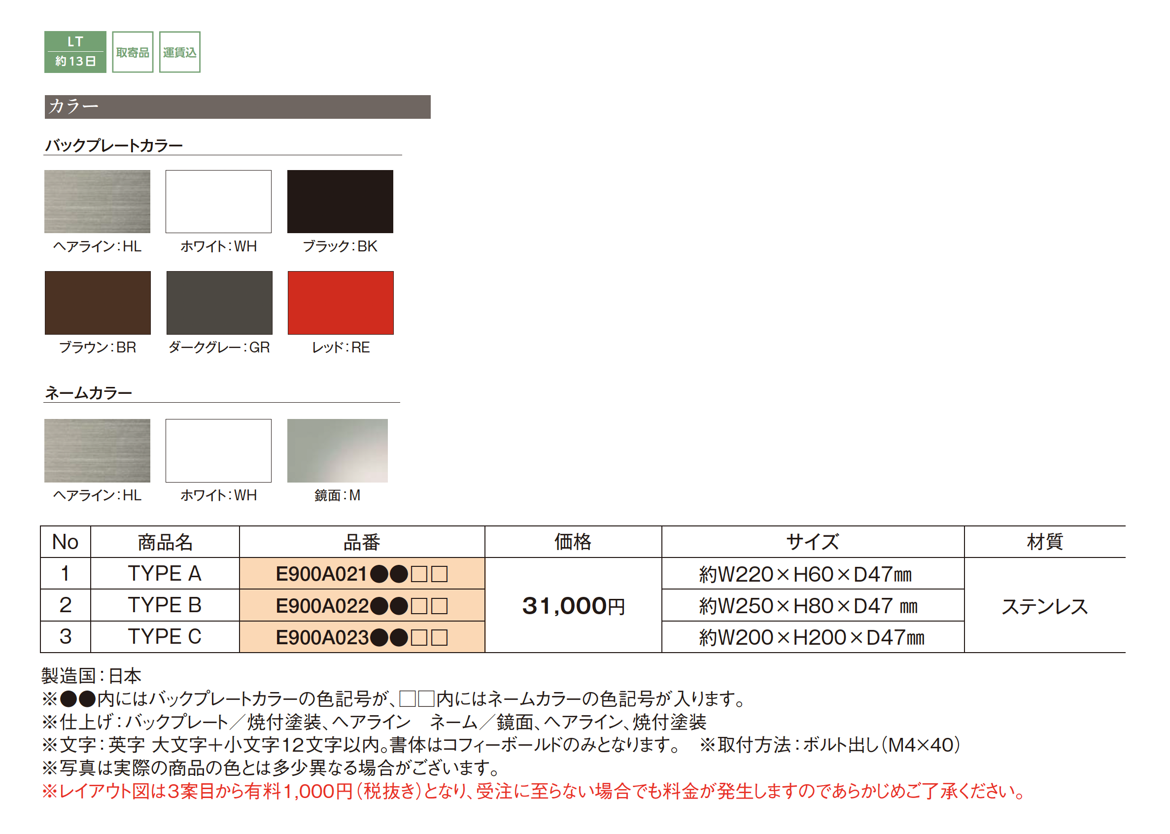 | カラー | HL:ヘアライン WH:ホワイト BK:ブラック BR:ブラウン GR:ダークグレー RE:レッド M:鏡面 |