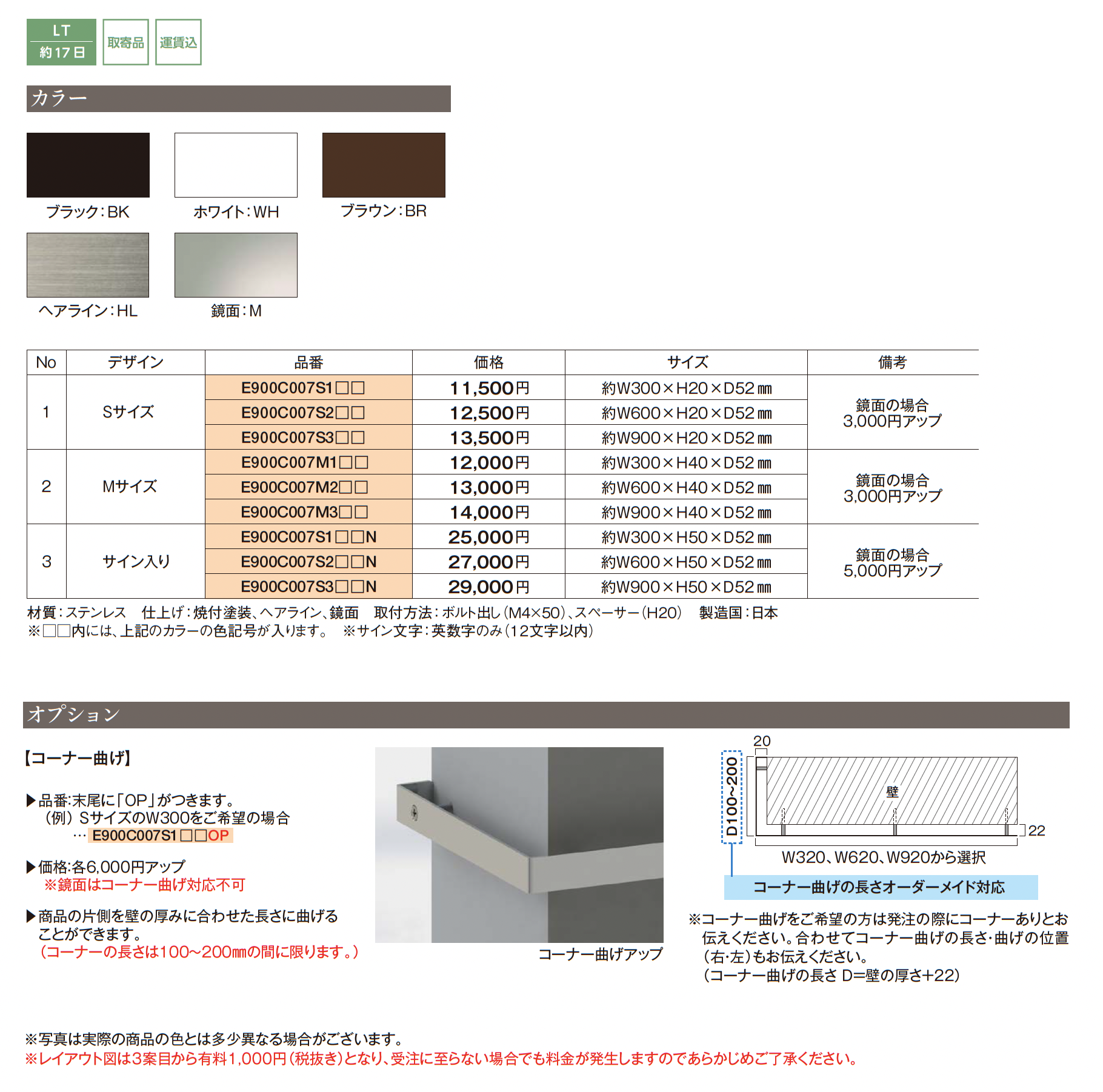 | カラー | BK:ブラック WH:ホワイト BR:ブラウン HL:ヘアライン M:鏡面 |