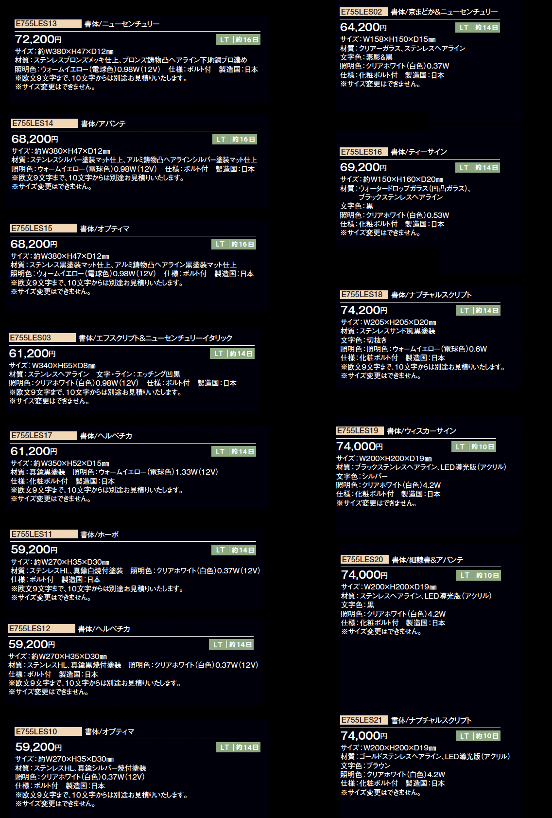 | カラー | ステンレスブロンズメッキ+電球色 ステンレスシルバー塗装+電球色 ステンレス黒塗装+電球色 ステンレスヘアライン+白色 真鍮黒塗装+電球色 真鍮白焼付塗装+白色 真鍮黒焼付塗装+白色 真鍮シルバー焼付塗装+白色 ガラス+ステンレスヘアライン+白色 ガラス+ブラックステンレスヘアライン+白色 黒塗装+電球色 真鍮硫化イブシ仕上+電球色 ブラックステンレスヘアライン+白色 ゴールドステンレスヘアライン+白色 |