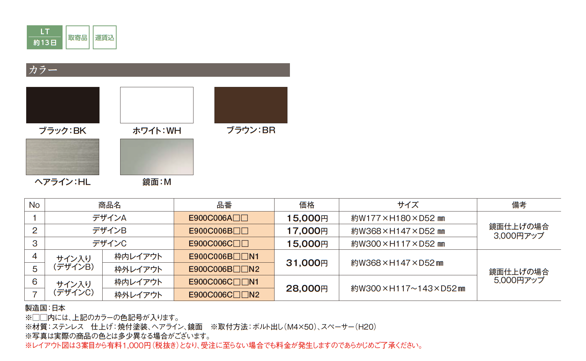 | カラー | BK:ブラック WH:ホワイト BR:ブラウン HL:ヘアライン M:鏡面 |