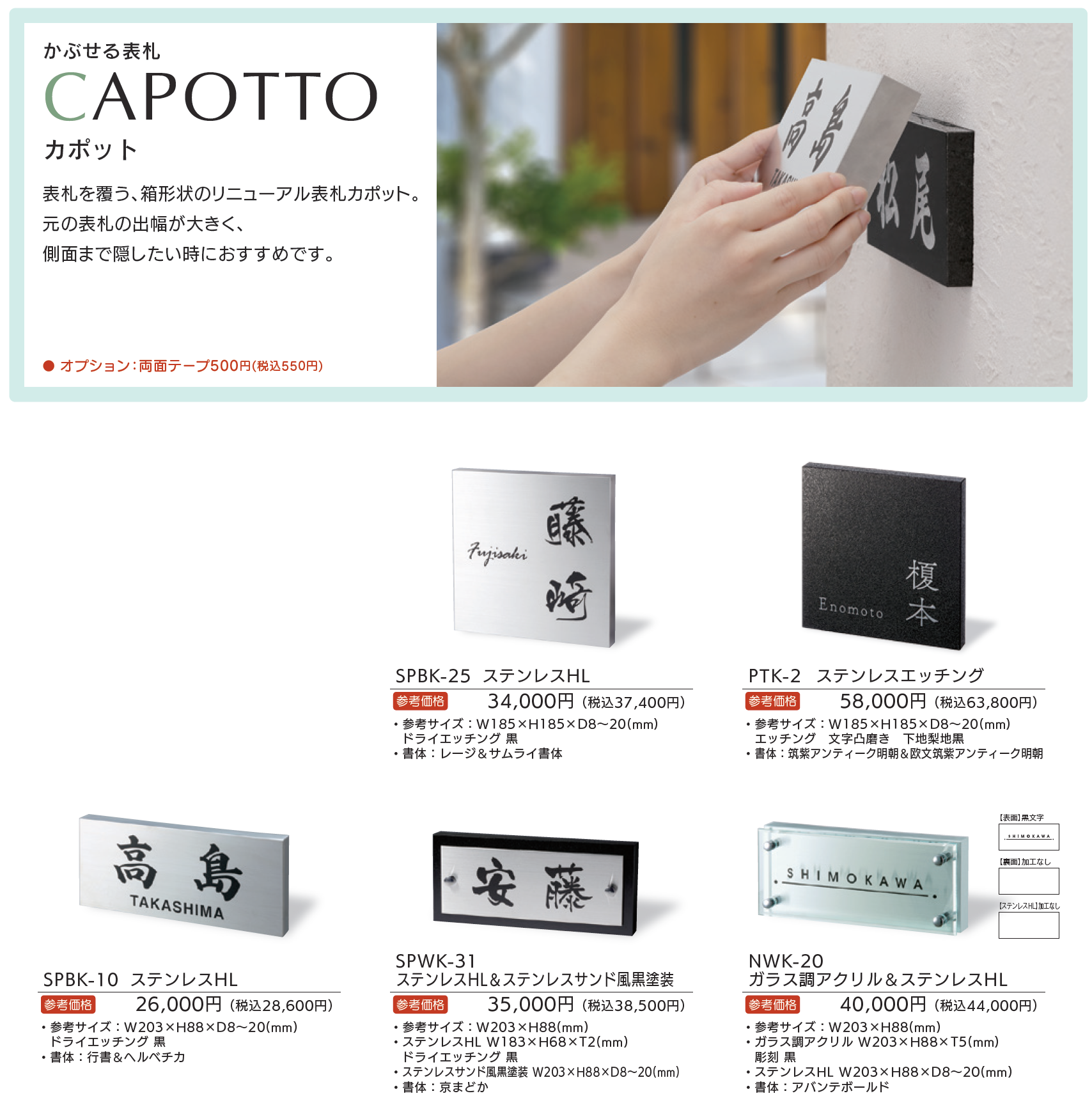 | 新旧品 | リニューアル表札 カポット【2025年版】(表札総合カタログWELNA Vol.23)カポット【2024年版】(表札総合カタログWELNA Vol.22)カポット【2023年版】(表札総合カタログWELNA Vol.21) |