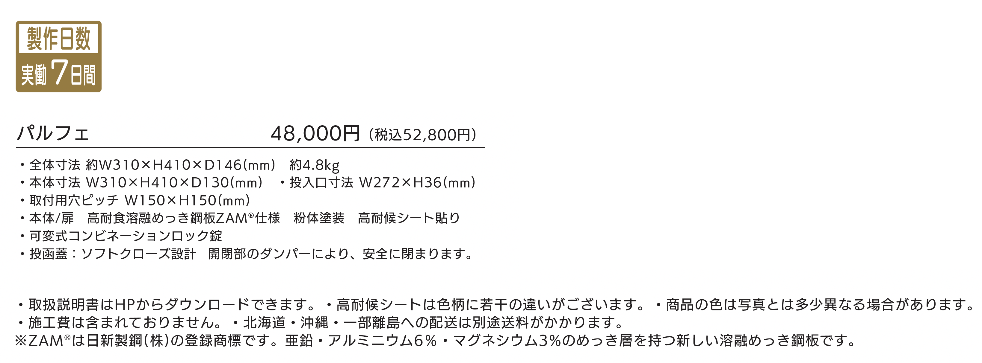 | 材質 | 高耐食溶融めっき鋼板ZAM®︎仕様 |