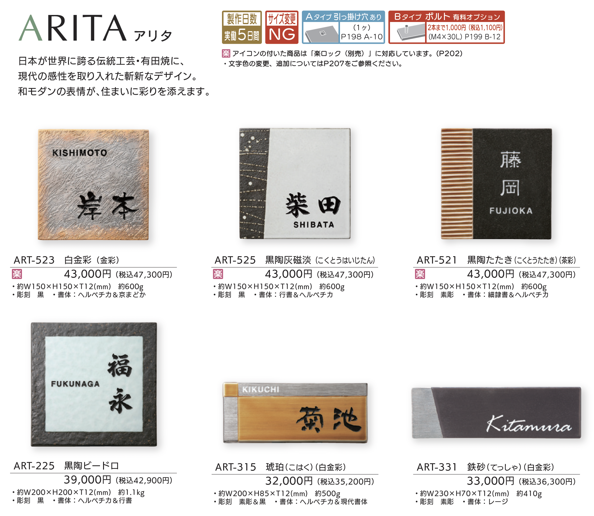 | 新旧品 | アリタ【2025年版】(表札総合カタログWELNA Vol.23)アリタ【2024年版】(表札総合カタログWELNA Vol.22)アリタ【2023年版】(表札総合カタログWELNA Vol.21) |