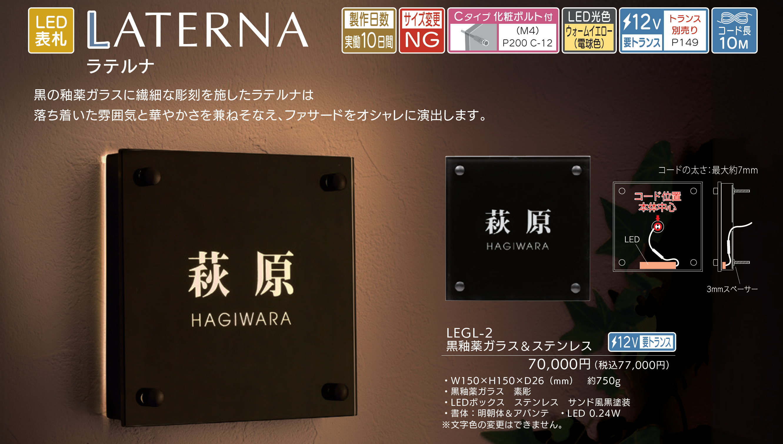 【商品説明】・LED光色:ウォームイエロー(電球色)/12V 要トランス/コード長10m/Cタイプ化粧ボルト付