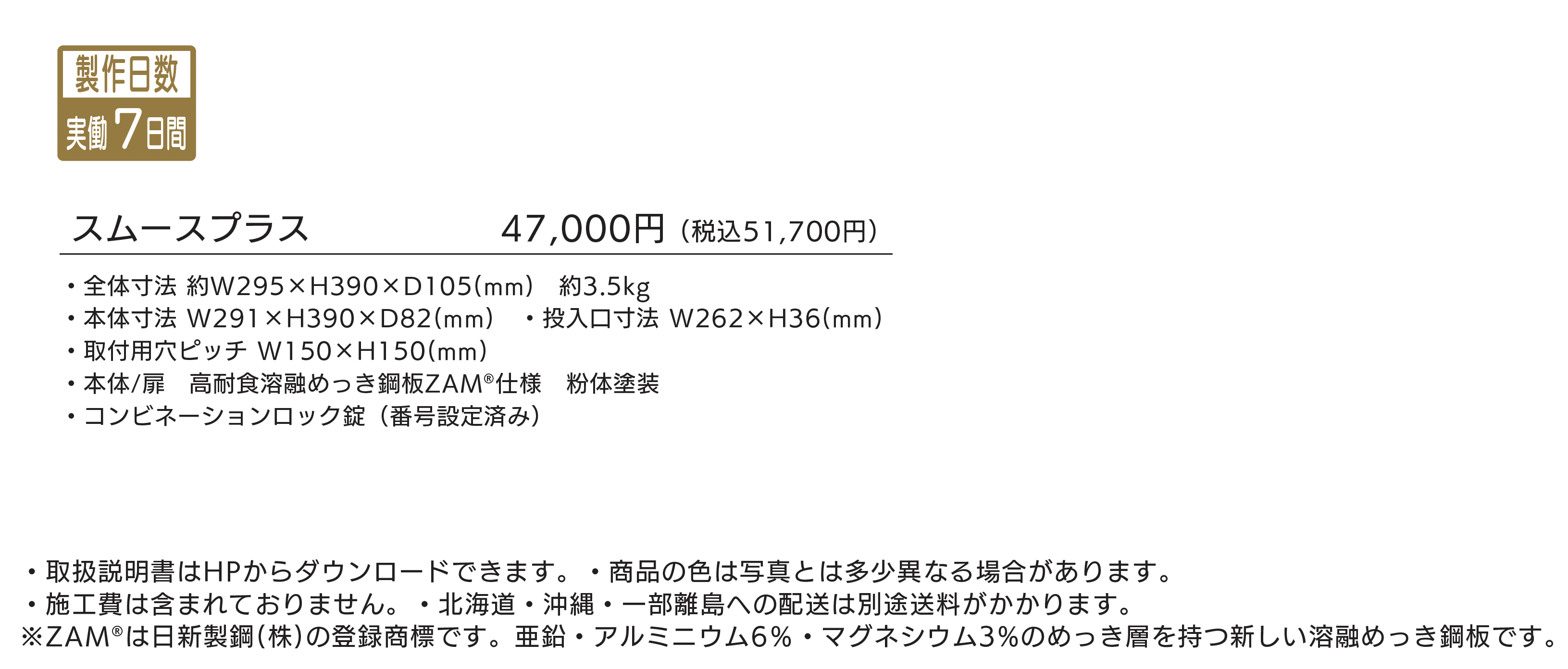 | 材質 | 高耐食溶融めっき鋼板ZAM®︎仕様 |
