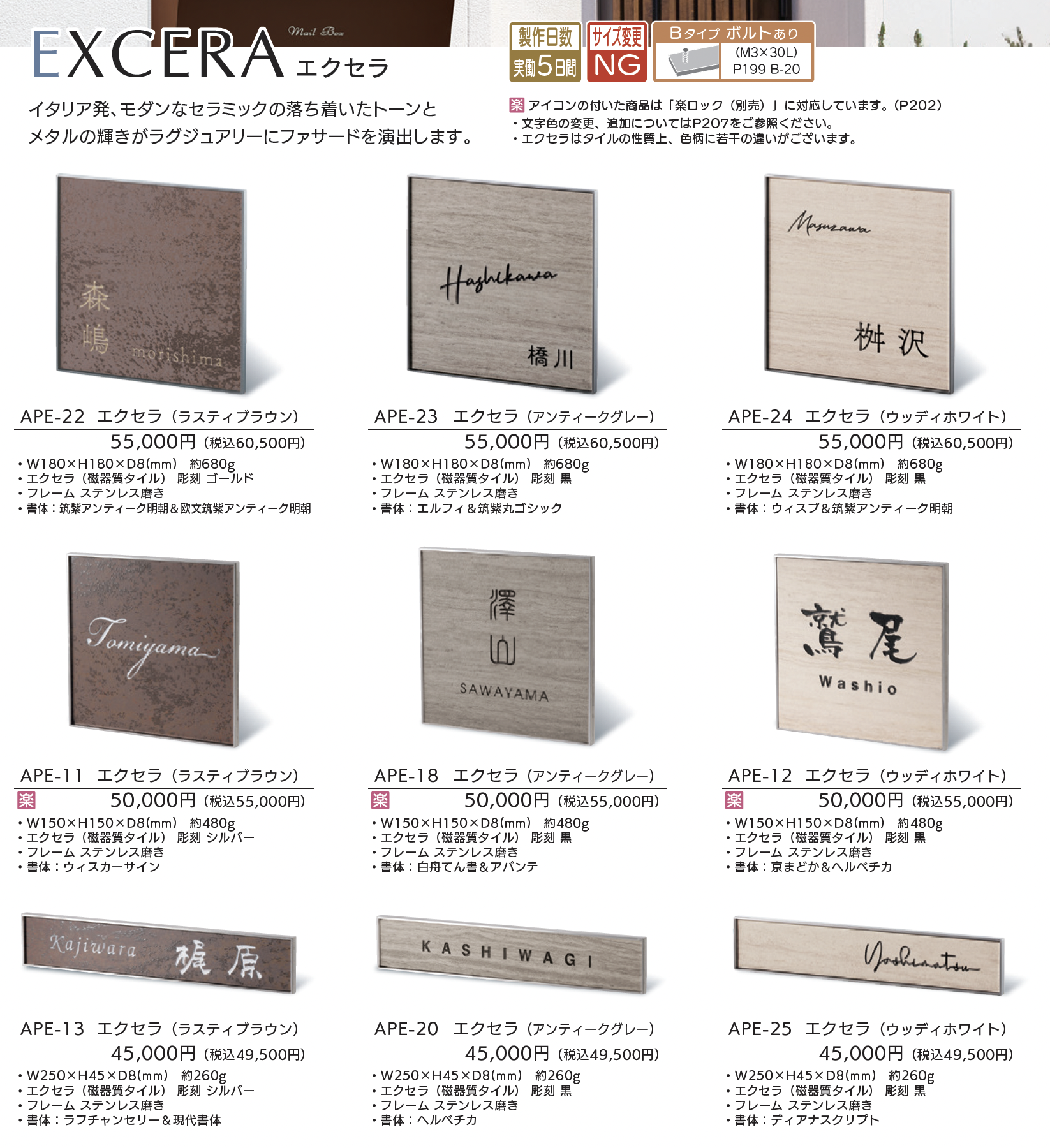 | 新旧品 | エクセラ【2025年版】(表札総合カタログWELNA Vol.23)エクセラ【2024年版】(表札総合カタログWELNA Vol.22)エクセラ【2023年版】(表札総合カタログWELNA Vol.21) |
