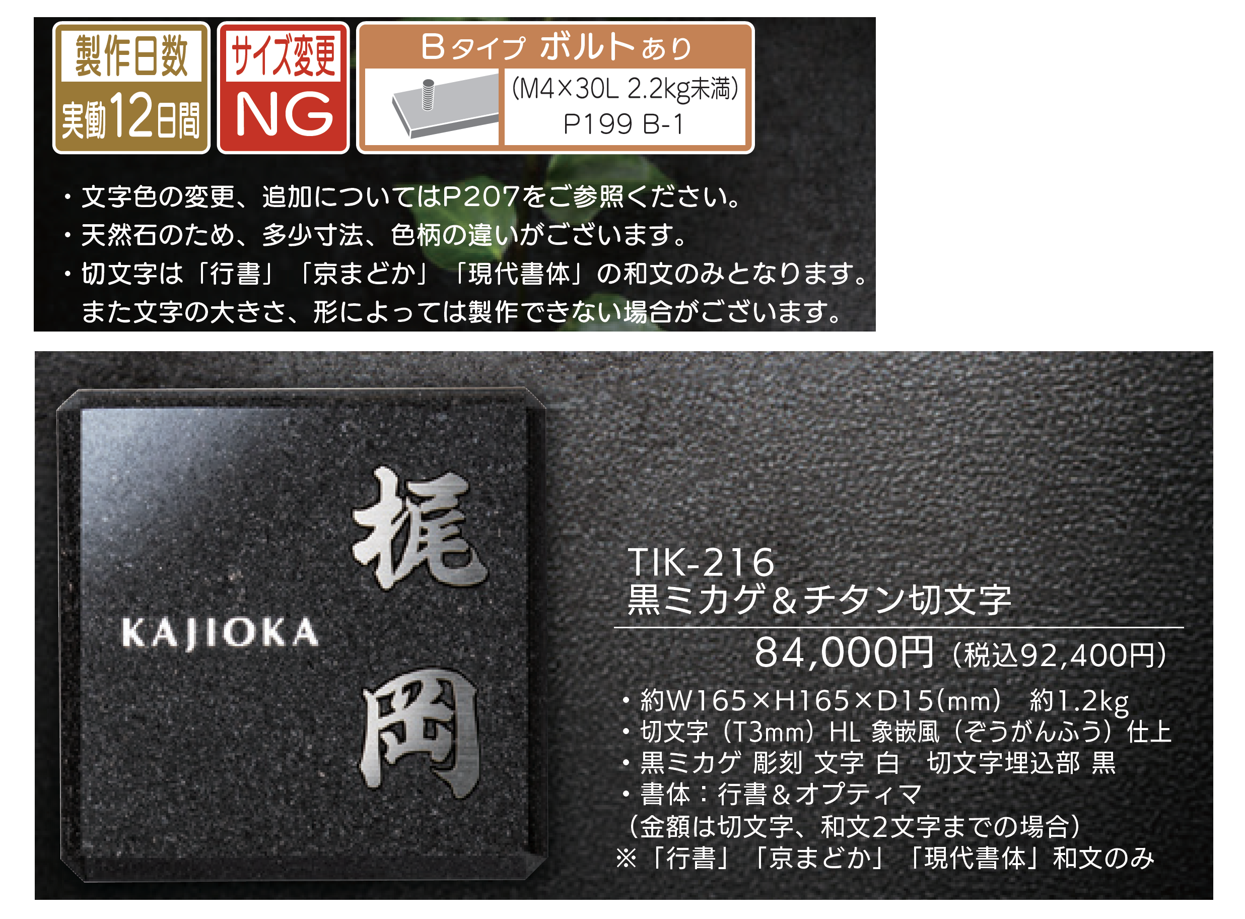 ●天然石のため、多少寸法、色柄の違いがございます。 ●切文字は「行書」「京まどか」「現代書体」に和文のみとなります。 また文字の大きさ、形によっては製作できない場合がございます。