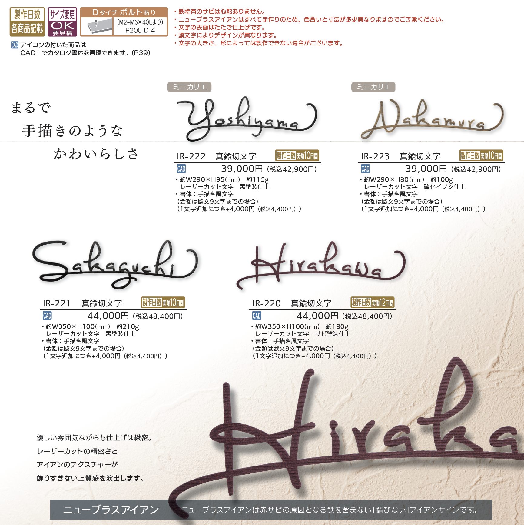 | 新旧品 | カリエ【2025年版】(表札総合カタログWELNA Vol.23)カリエ【2024年版】(表札総合カタログWELNA Vol.22)ニューブラスアイアン・カリエ【2023年版】(表札総合カタログWELNA Vol.21) |