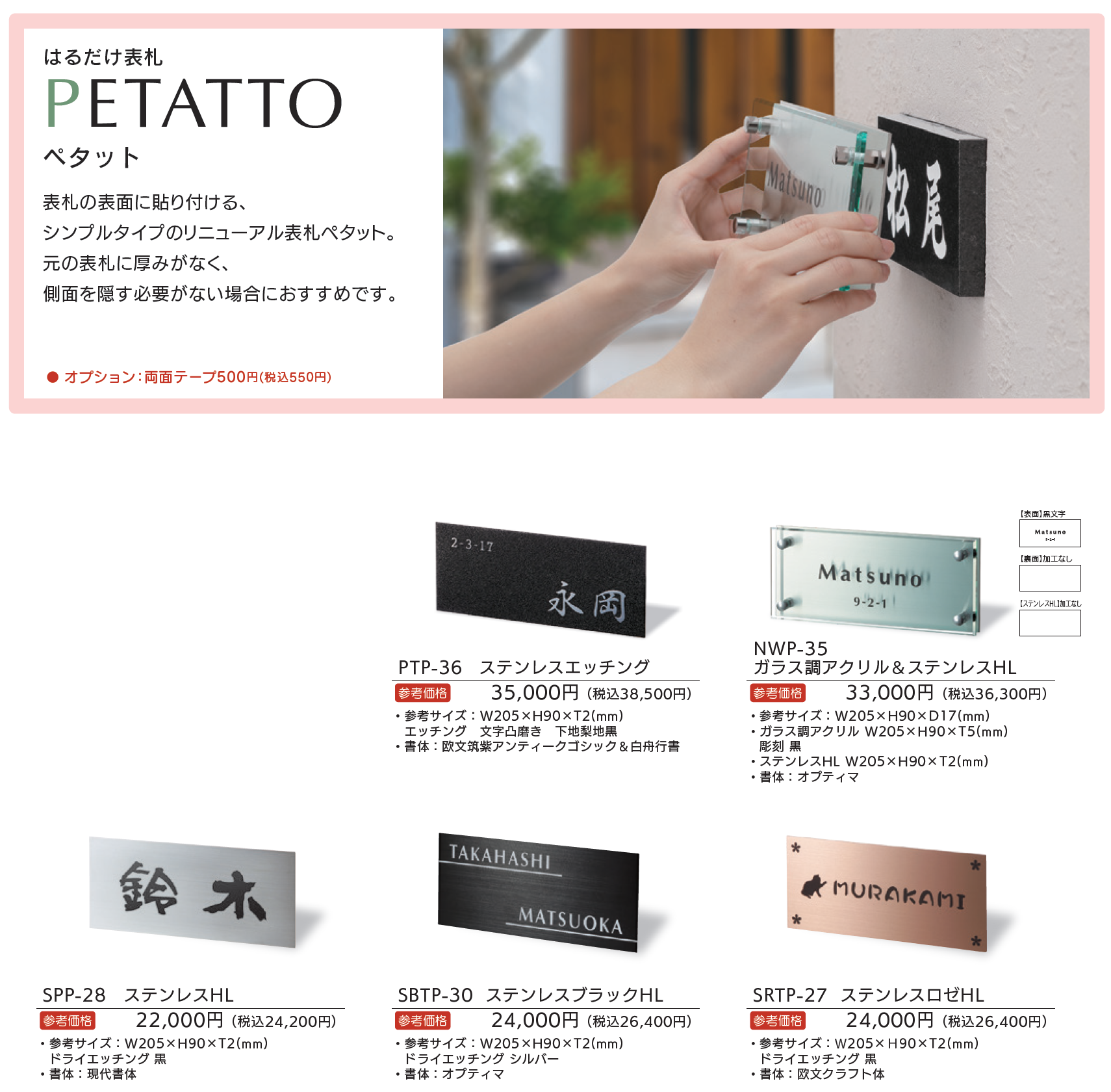| 新旧品 | リニューアル表札 ペタット【2025年版】(表札総合カタログWELNA Vol.23)ペタット【2024年版】(表札総合カタログWELNA Vol.22)ペタット【2023年版】(表札総合カタログWELNA Vol.21) |