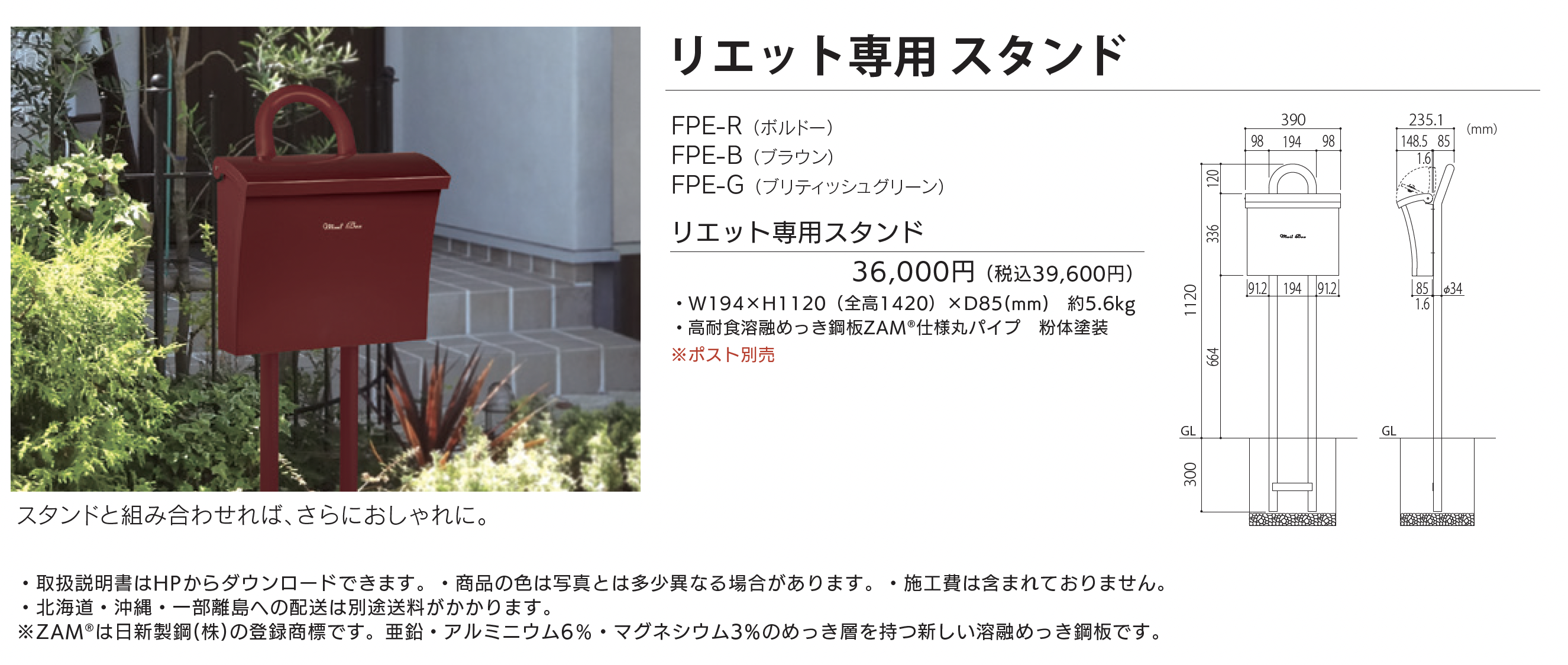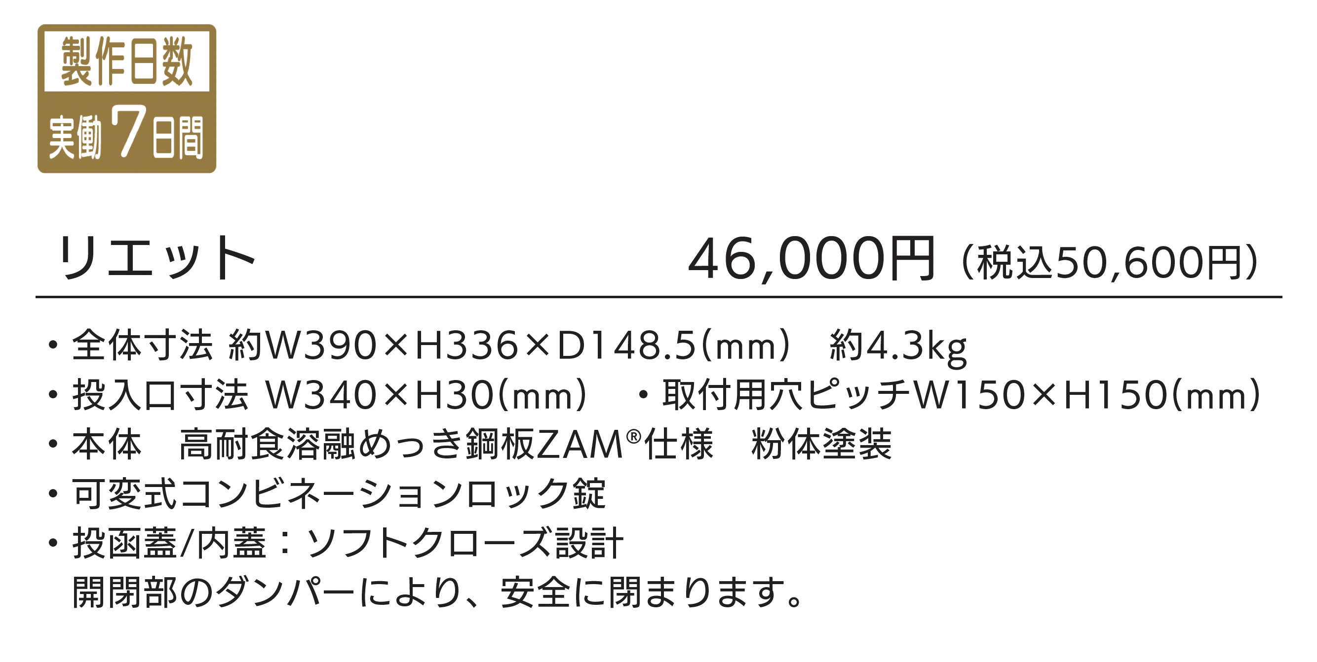 | 材質 | 高耐食溶融めっき鋼板ZAM®︎仕様 |