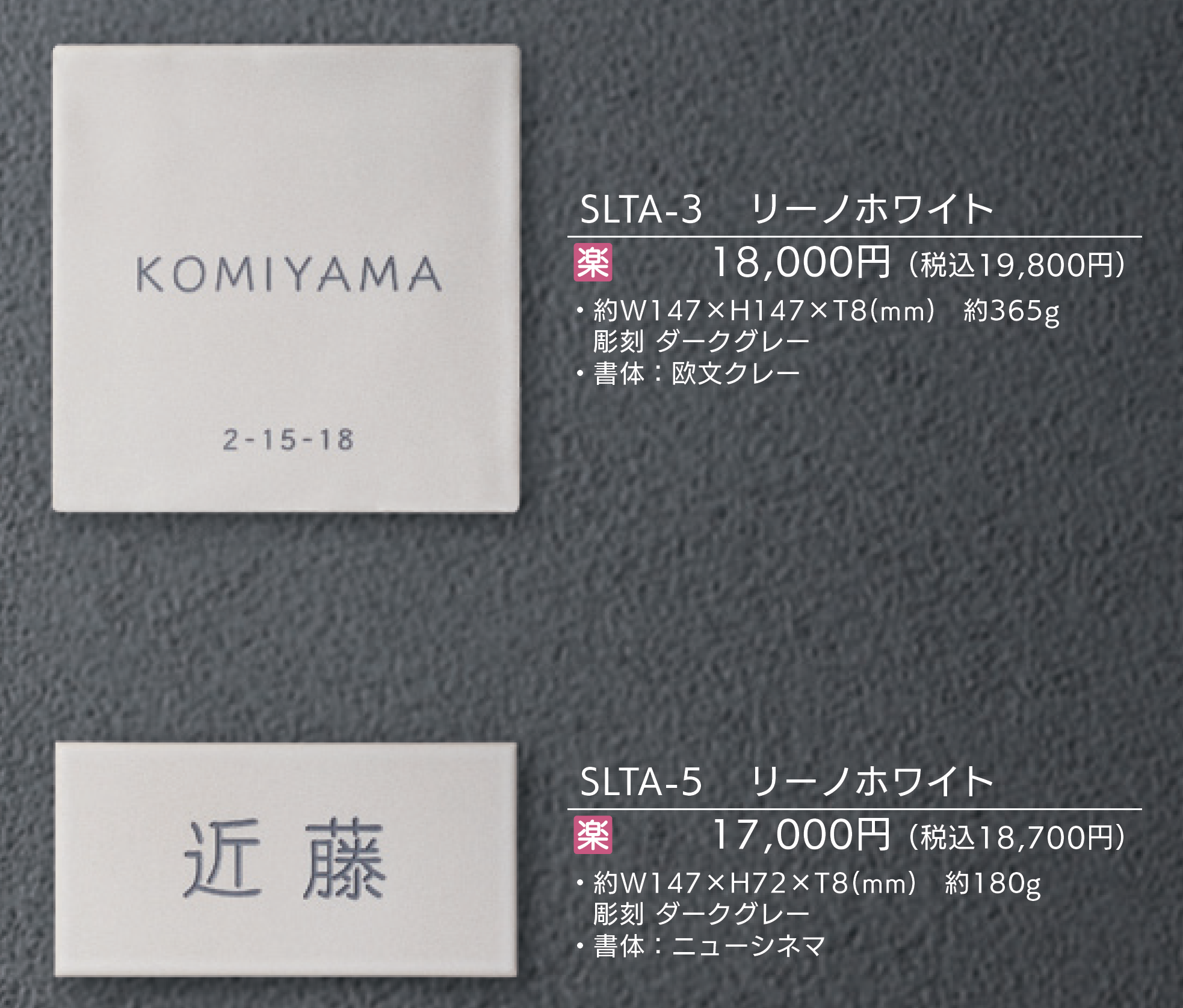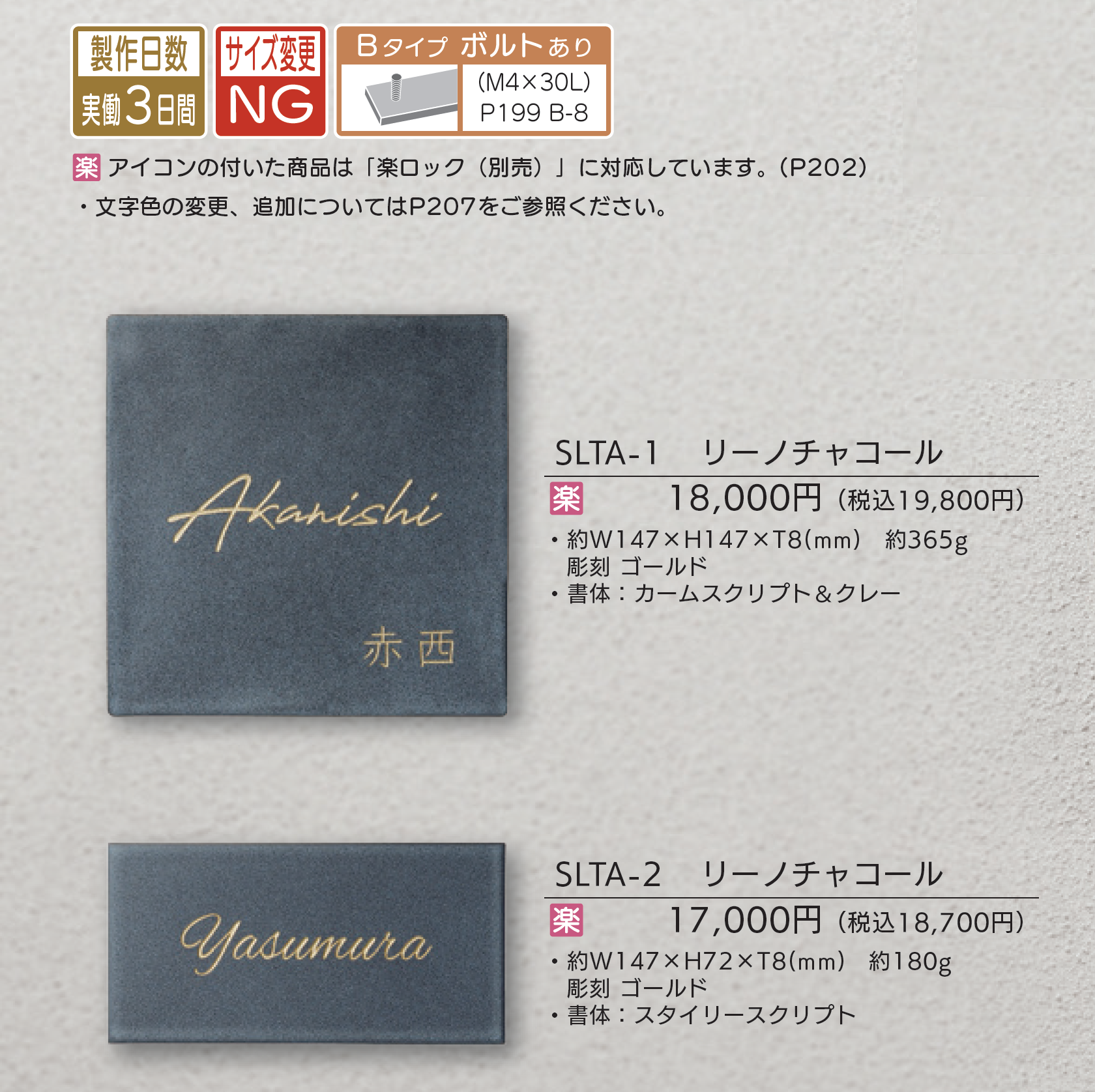 | 新旧品 | リーノ【2025年版】(表札総合カタログWELNA Vol.23)リーノ【2024年版】(表札総合カタログWELNA Vol.22) |