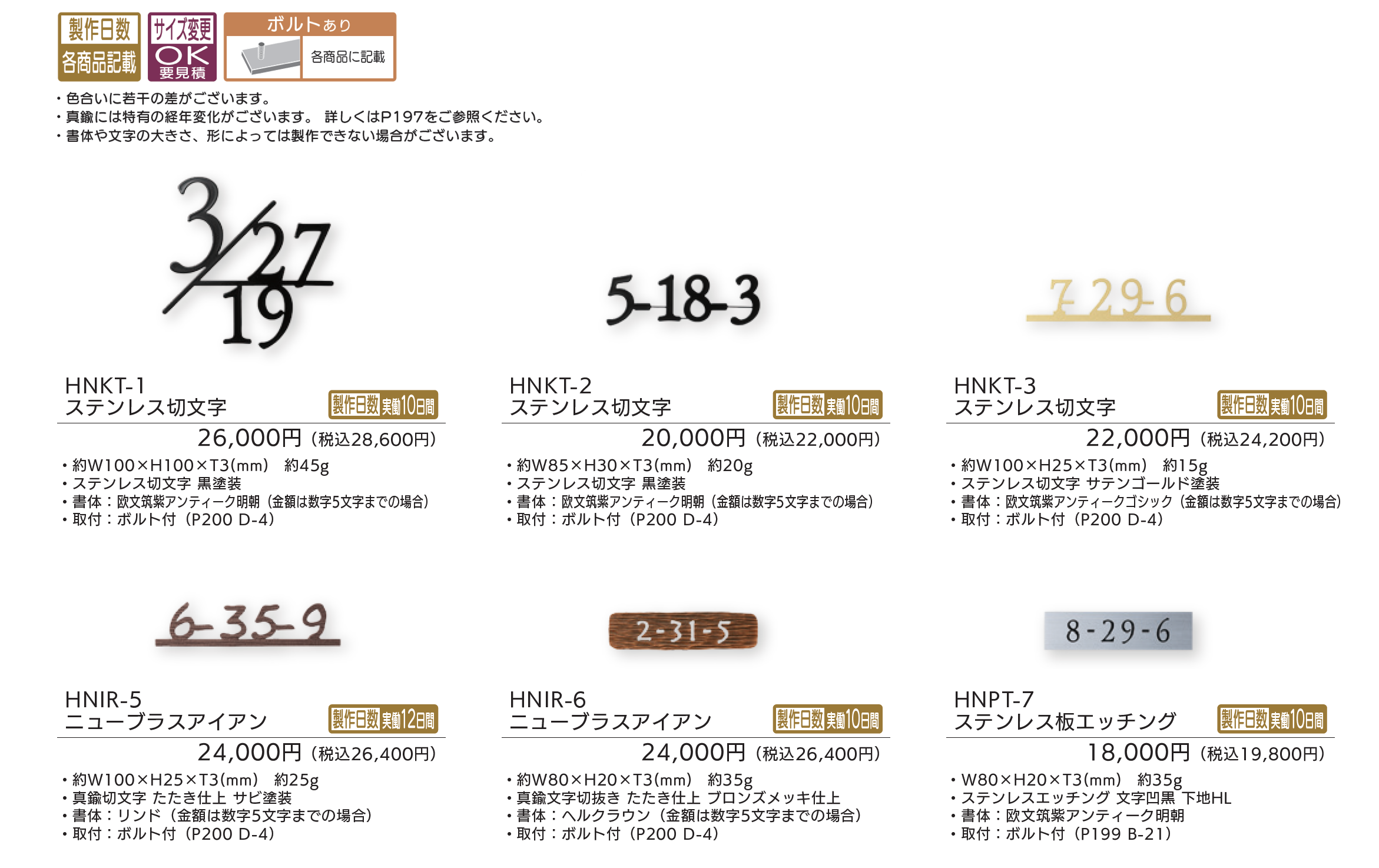 | 新旧品 | ハウスナンバー【2025年版】(表札総合カタログWELNA Vol.23)ハウスナンバー【2024年版】(表札総合カタログWELNA Vol.22) |
