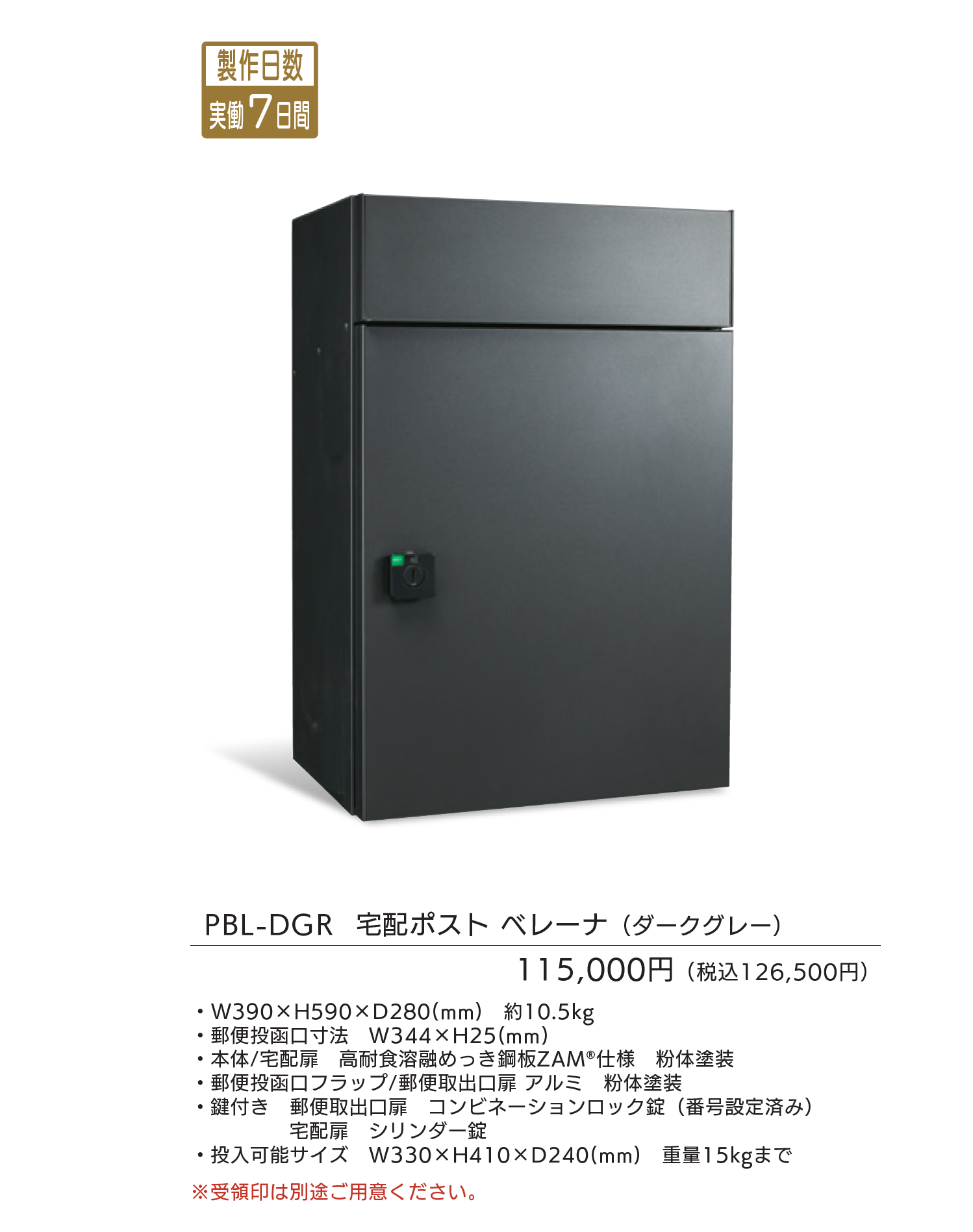 グランドウォール ランパードカーゴに取り付けが可能です。 ※その他の門柱には取り付けできません。 ※宅配ポストの取り付けは現場加工になります。 ※宅配ポスト べレーナと、ランパードカーゴ専用宅配ポストは同じ商品です。 ※宅配ポスト前面部、本体部底面の水抜き穴をふさがないでください。 ※水平に施工してください。宅配ポストの変形、故障の原因となります。 ※郵便物を取り出した後は必ず扉を閉めて施錠してください。 郵便物が過度に多い場合や重量物の場合に取出口扉が開いてしまう場合があります。 ※商品の色は、写真とは多少異なる場合がございます。 ※施工費は含まれておりません。 ※北海道・沖縄・一部離島への配送は別途送料がかかります。 (※)ZAM®は日新製鋼(株)の登録商標です。亜鉛・アルミニウム6%・マグネシウム3%のめっき層を持つ新しい溶融めっき鋼板です。