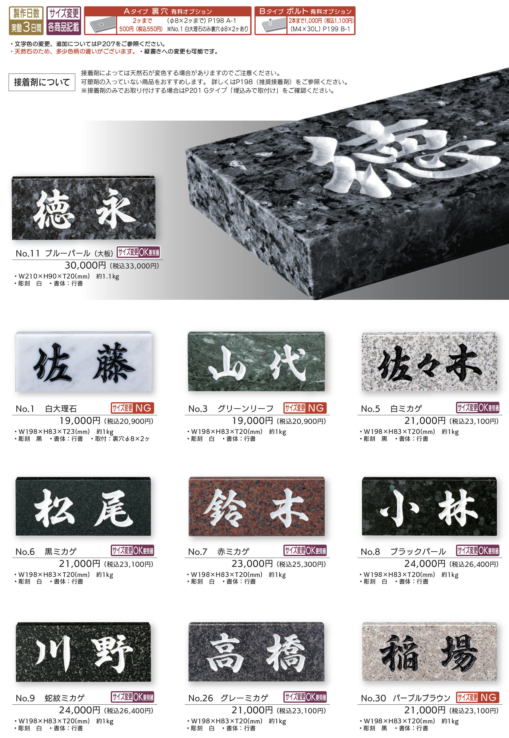 | 材質 | グリーンリーフ グレーミカゲ ブラックパール ブルーパール 白ミカゲ 蛇紋ミカゲ 赤ミカゲ 黒ミカゲ パープルブラウン 白大理石 |