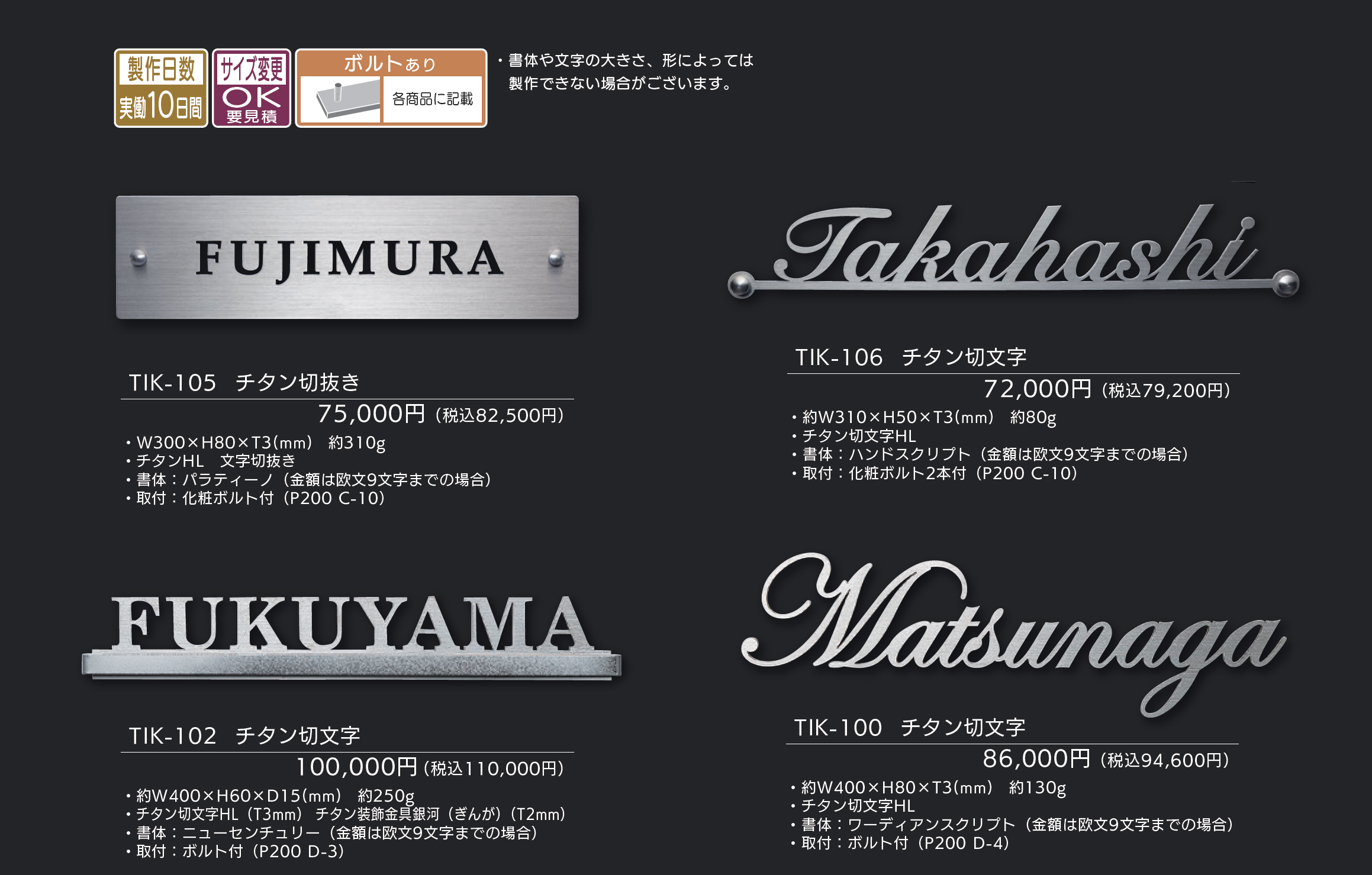 | 新旧品 | チタン切文字【2025年版】(表札総合カタログWELNA Vol.23)チタン切文字【2024年版】(表札総合カタログWELNA Vol.22)チタン切文字【2023年版】(表札総合カタログWELNA Vol.21) |
