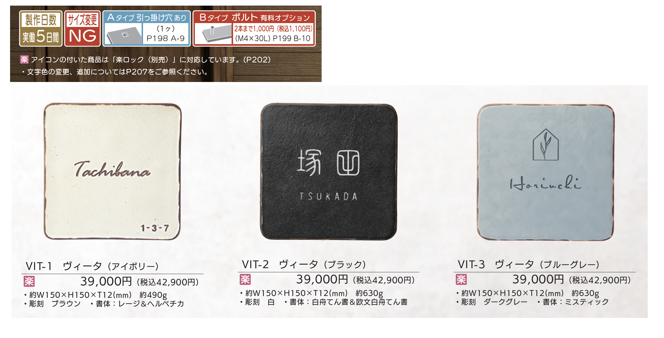 | 新旧品 | ヴィータ【2025年版】(表札総合カタログWELNA Vol.23)ヴィータ【2024年版】(表札総合カタログWELNA Vol.22)ヴィータ【2023年版】(表札総合カタログWELNA Vol.21) |