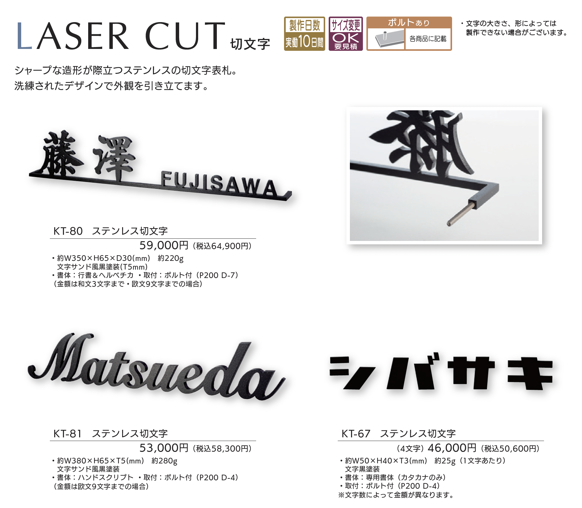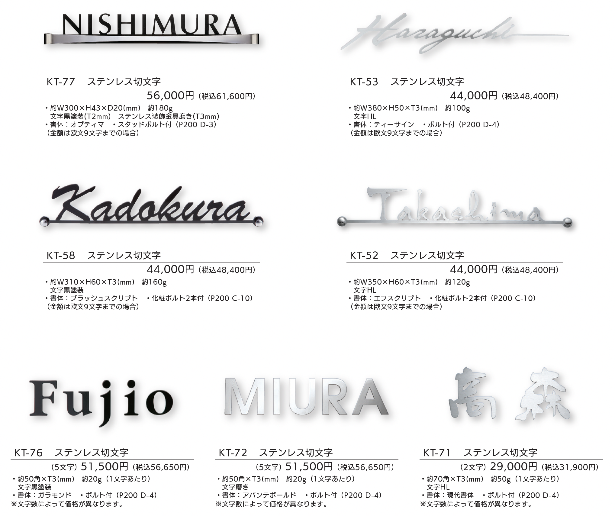 | 新旧品 | 切文字【2025年版】(表札総合カタログWELNA Vol.23)ステンレス切文字【2024年版】(表札総合カタログWELNA Vol.22)ステンレス切文字【2023年版】(表札総合カタログWELNA Vol.21) |