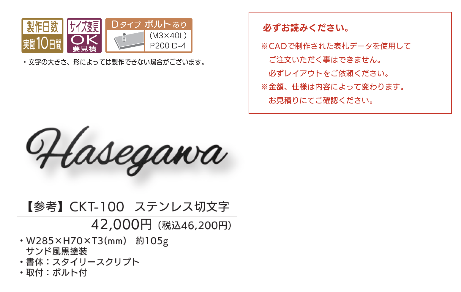 ● 文字の大きさ、形によっては製作できない場合がございます。 ※CADで制作された表札データを使用してご注文頂く事はできません。必ずレイアウトをご依頼ください。