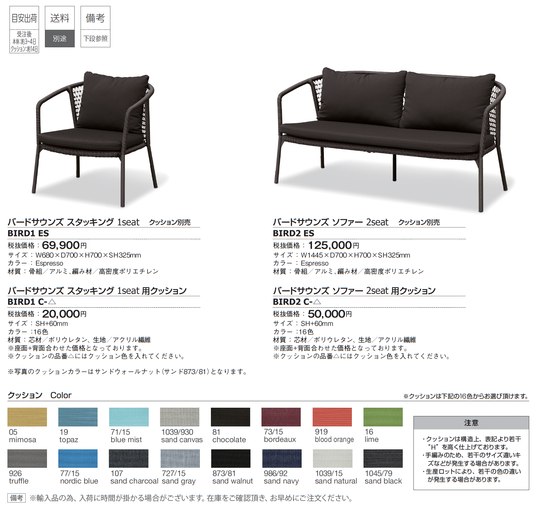 | カラー | 05:mimosa 19:topaz 71/15:blue mist 1039/930:sand canvas 81:chocolate 73/15:bordeaux 919:blood orange 16:lime 926:truffle 77/15:nordic blue 107:sand charcoal 727/15:sand gray 873/81:sand walnut 986/92:sand navy 1039/15:sand natural 1045/79:sand black DB:ダークブラウン CH:チャコールカラー WG:ホワイトグレー NA:ナチュラル GB:グレイブラック |