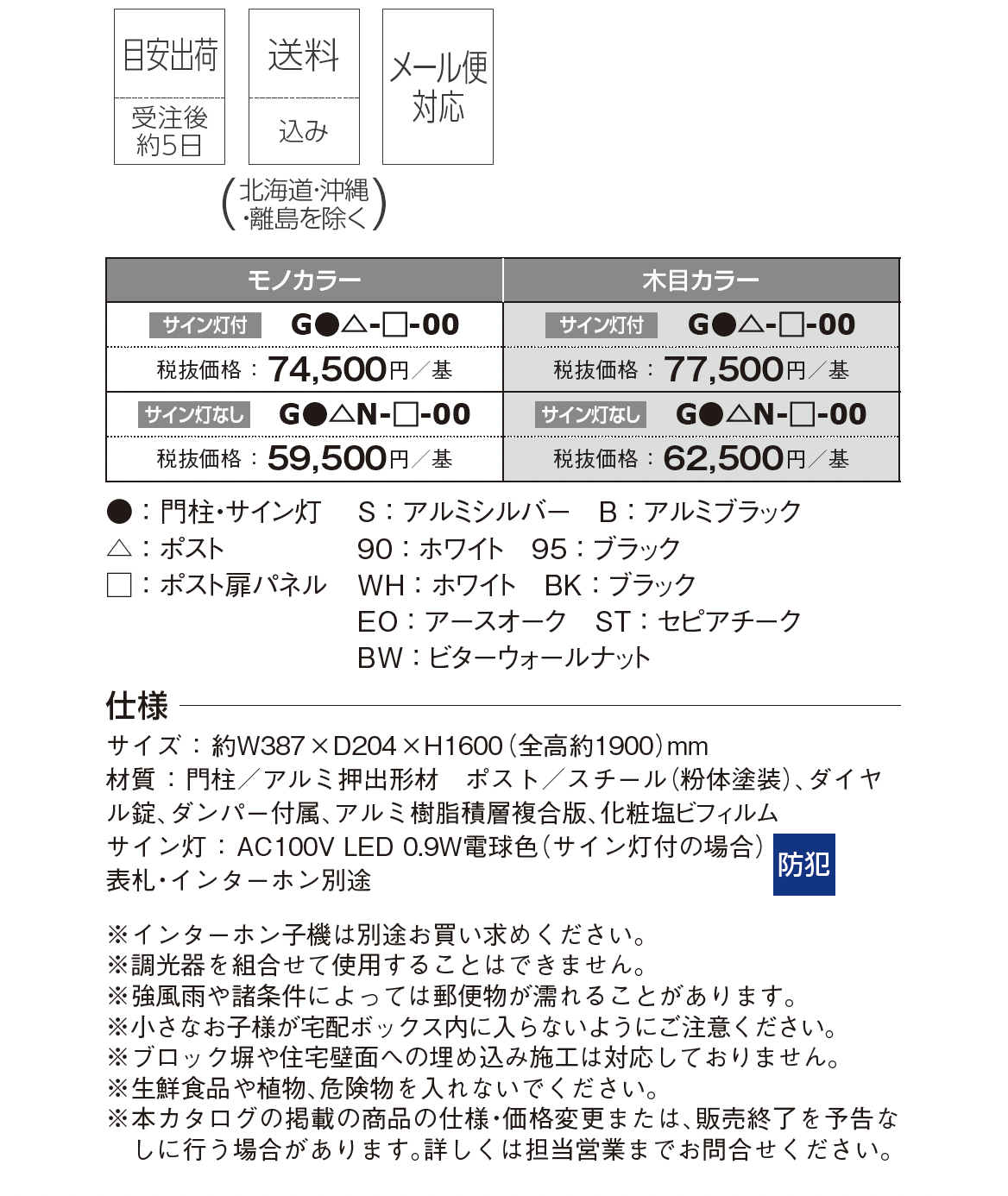 | カラー | H:ステンカラー 70:ホワイト 80:ブラック B:ブラック EO:アースオーク ST:セピアチーク BW:ビターウォールナット 電球色 |