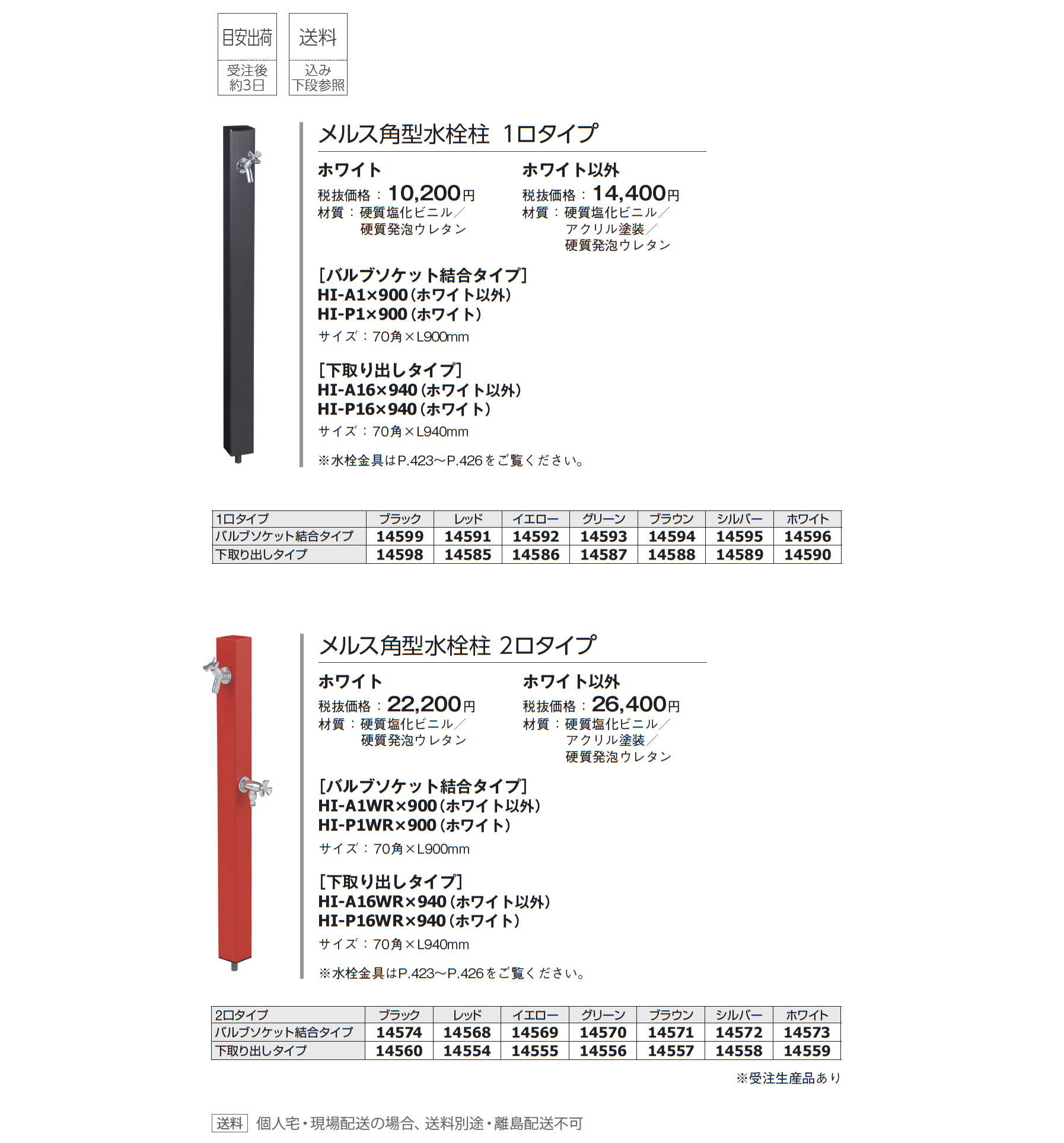 | 新旧品 | メルス角型水栓柱/スクエアパン【2025年版】(ギャザー2025 vol.14)メルス角型水栓柱【2024年版】(ギャザー2024 vol.13) |