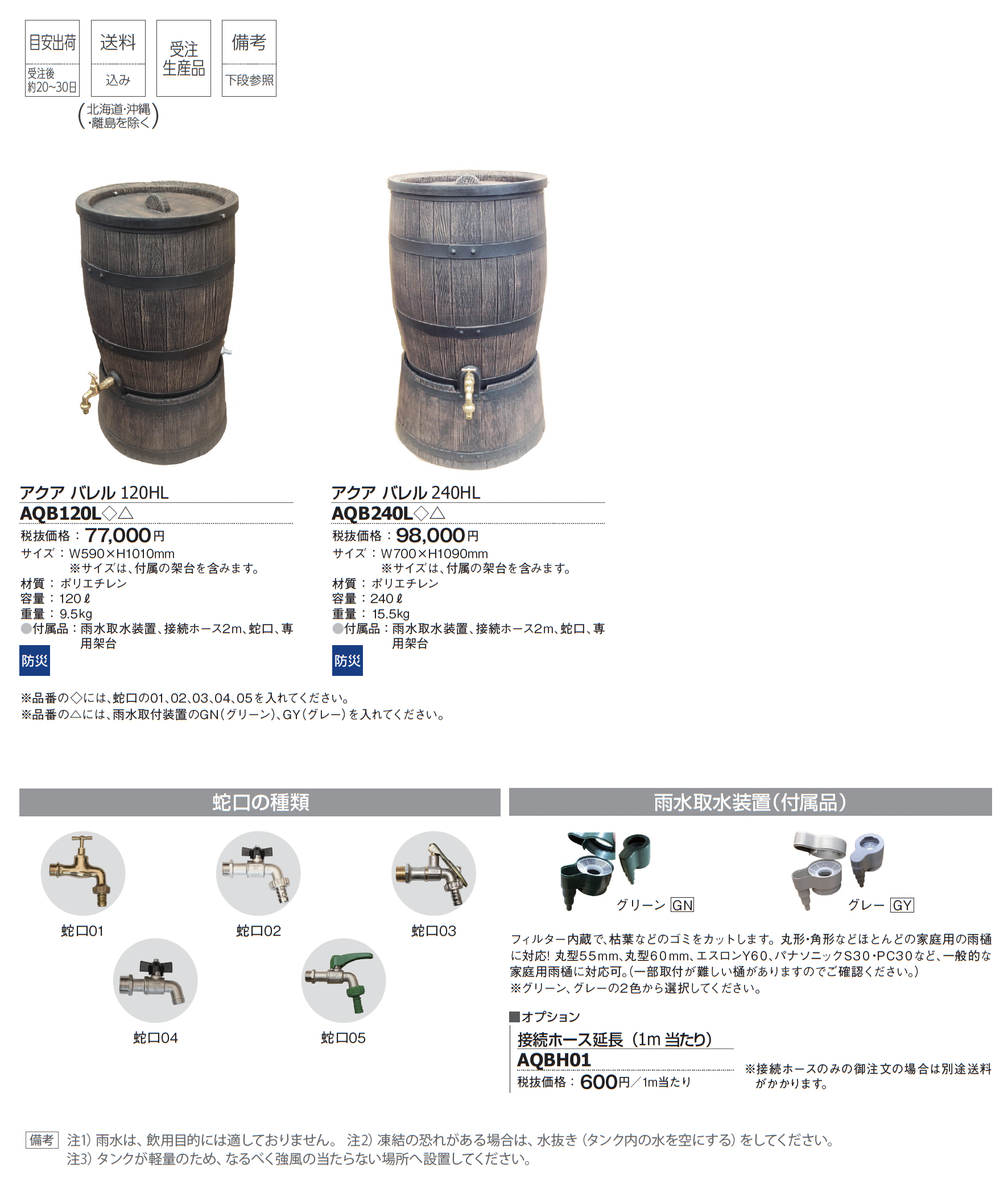 | 新旧品 | 雨水タンク アクア バレル【2025年版】(ギャザー2025 vol.14)雨水タンク アクア バレル【2024年版】(ギャザー2024 vol.13) |