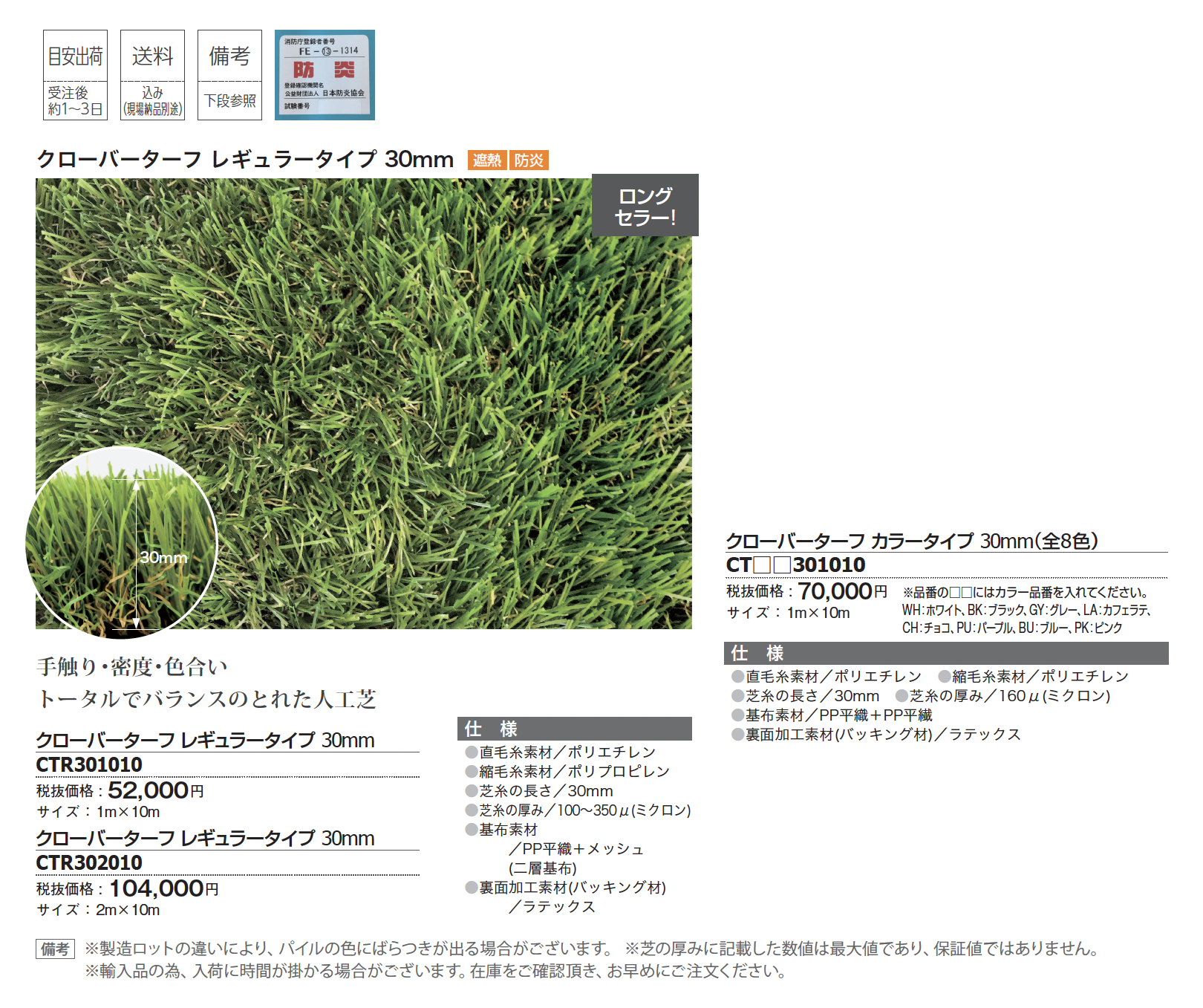 | 新旧品 | 人工芝 クローバーターフ レギュラータイプ【2025年版】(ギャザー2025 vol.14)クローバーターフ レギュラータイプ【2024年版】(ギャザー2024 vol.13) |