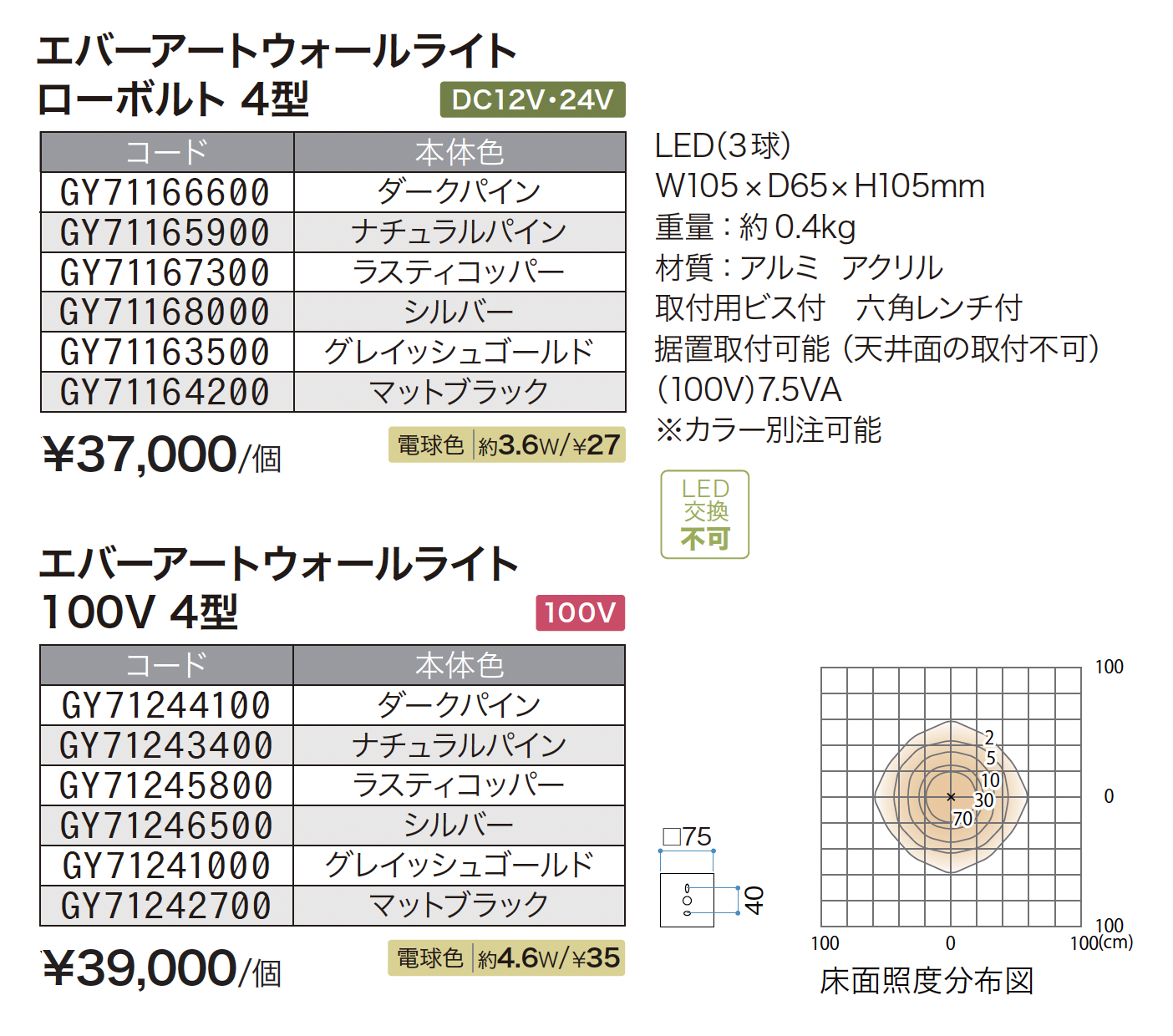 ※ローボルト(12V/24V)ライトをご使用の際にはローボルトトランス、ジャンクションボックス、専用コード等のアクセサリーが必要となります。 ※LEDには明るさや発光色に多少のバラツキがあります。同一商品の場合でも商品ごとに明るさや発光色が異なる場合があります。 ※商品により採用しているLEDの発光効率が異なりますので、LEDのW数ではなく照度表にて明るさをご確認下さい。 ※LED電球およびモジュールにつきましては、予告なく変更することがありますのでご了承下さい。 ※表示価格には消費税および組立費、施工費等は含まれておりません。 ※定価5万円以上は送料込みです。