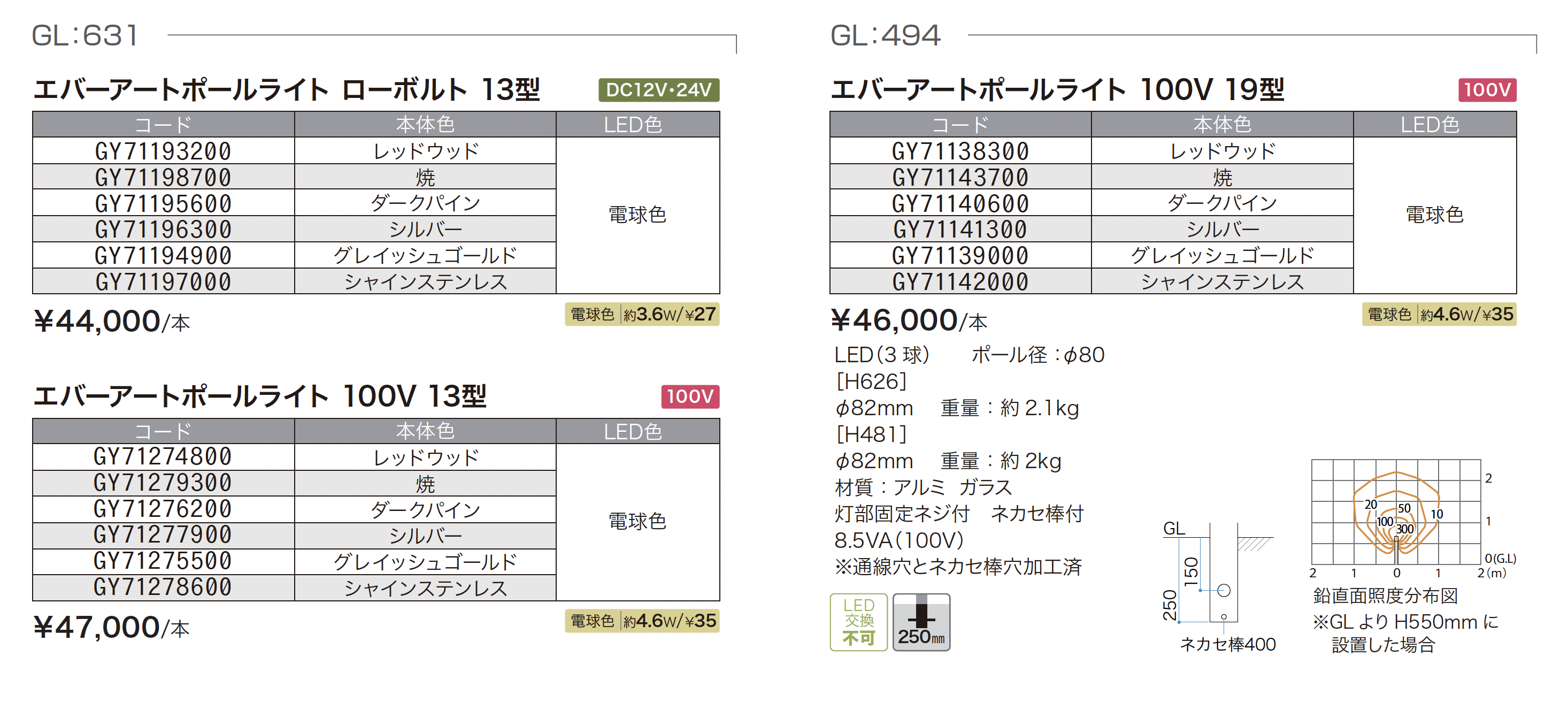 ※ローボルト(12V/24V)ライトをご使用の際にはローボルトトランス、ジャンクションボックス、専用コード等のアクセサリーが必要となります。 ※LEDには明るさや発光色に多少のバラツキがあります。同一商品の場合でも商品ごとに明るさや発光色が異なる場合があります。 ※商品により採用しているLEDの発光効率が異なりますので、LEDのW数ではなく照度表にて明るさをご確認下さい。 ※LED電球およびモジュールにつきましては、予告なく変更することがありますのでご了承下さい。 ※表示価格には消費税および組立費、施工費等は含まれておりません。 ※定価5万円以上は送料込みです。