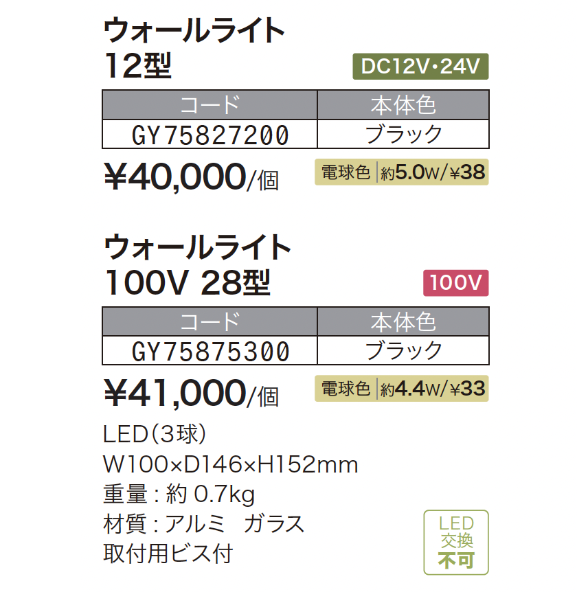※ローボルト(12V/24V)ライトをご使用の際にはローボルトトランス、ジャンクションボックス、専用コード等のアクセサリーが必要となります。 ※LEDには明るさや発光色に多少のバラツキがあります。同一商品の場合でも商品ごとに明るさや発光色が異なる場合があります。 ※商品により採用しているLEDの発光効率が異なりますので、LEDのW数ではなく照度表にて明るさをご確認下さい。 ※LED電球およびモジュールにつきましては、予告なく変更することがありますのでご了承下さい。 ※表示価格には消費税および組立費、施工費等は含まれておりません。 ※定価5万円以上は送料込みです。