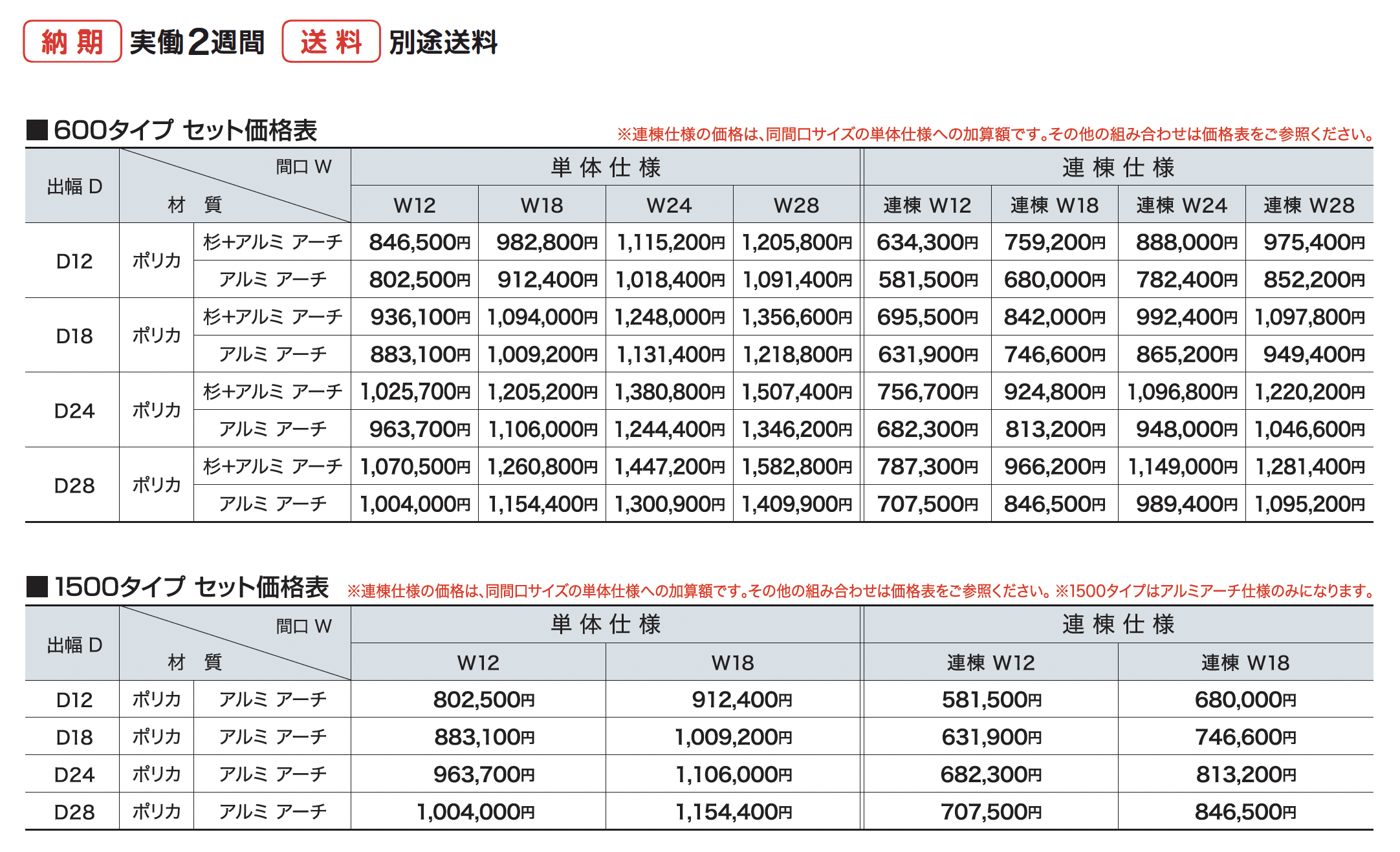 | 強度 | 耐積雪性能:20cm相当(600タイプ) 耐積雪性能:50cm相当(1500タイプ) 耐風圧性能38m/秒相当 |