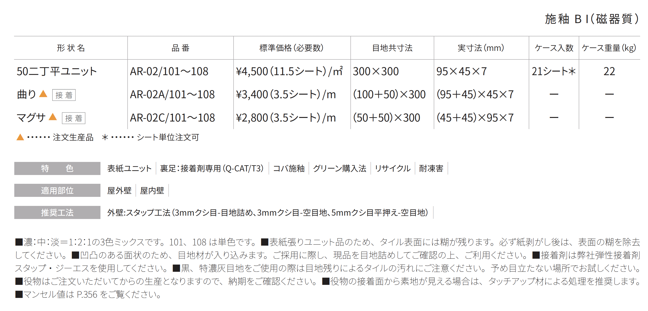 増加する接着剤張り施工に対応する特殊技術による、コバ施釉と接着剤張り用の裏足。