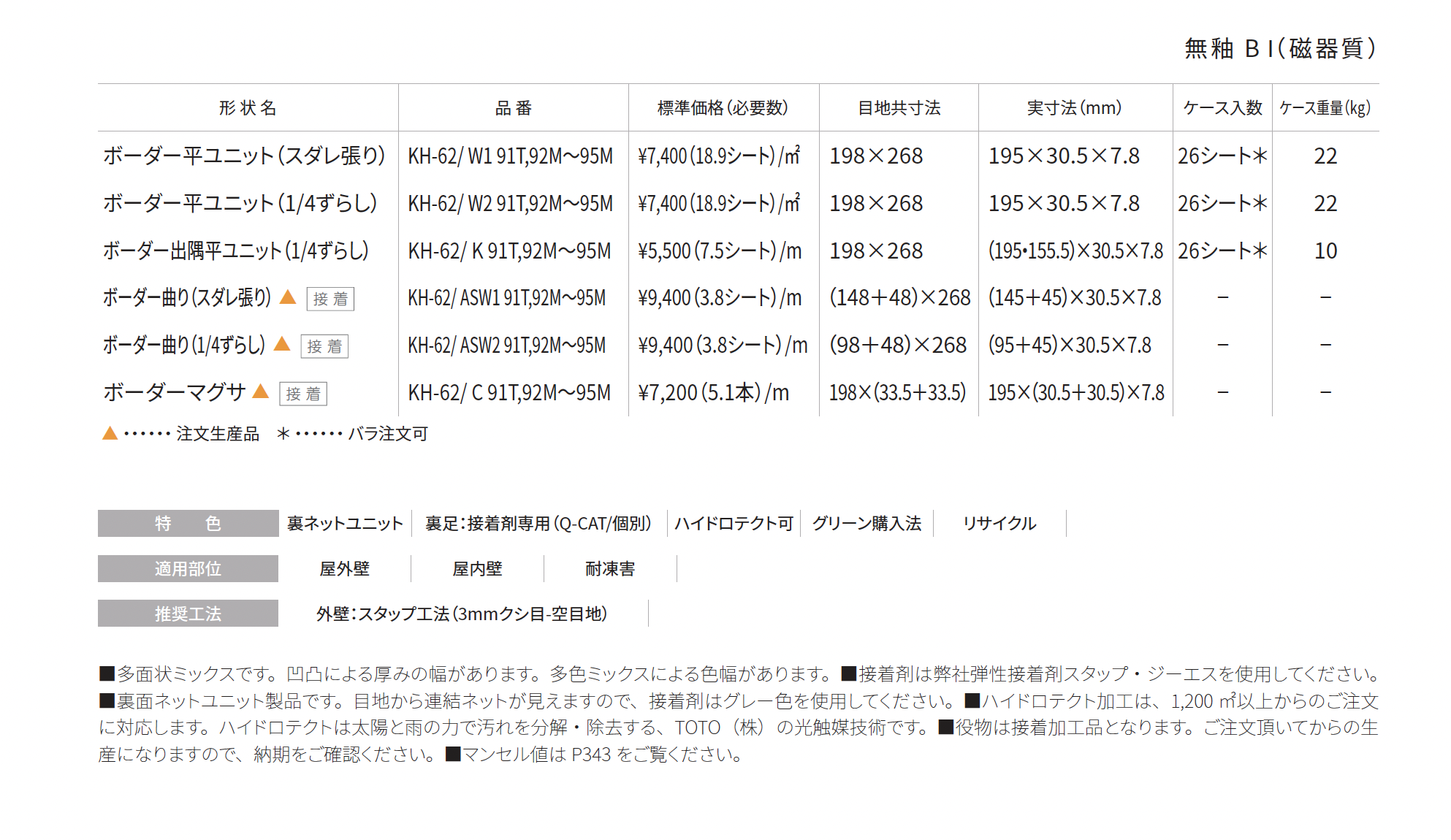 柔らかな石面と、無のマットなカラー展開が特徴のボーダータイルです。 タイルの表情をより楽しめる、少し幅広なサイズで建物を上品に引き立てます。