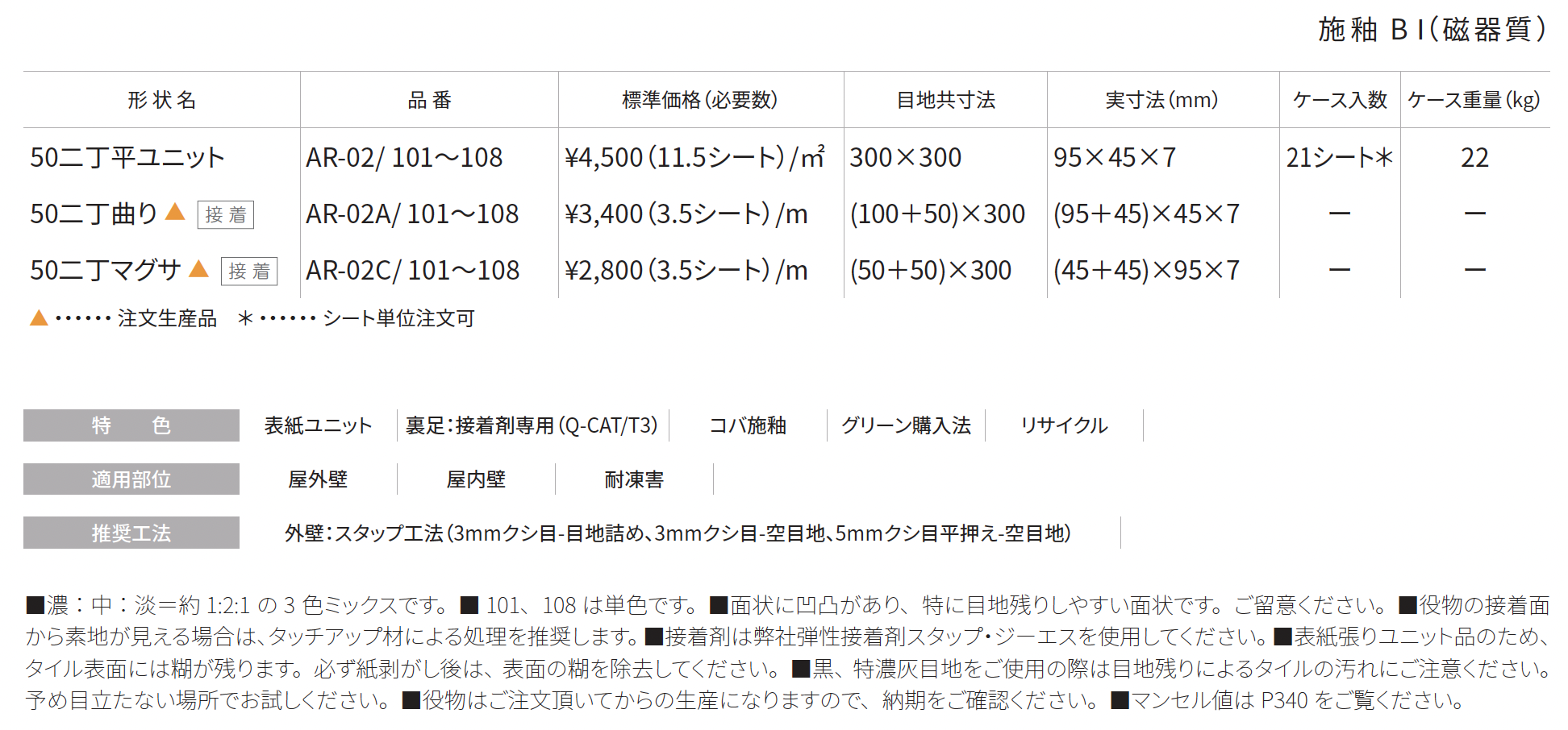 増加する接着剤張り施工に対応する特殊技術による、コバ施釉と接着剤張り用の裏足。 2つのハツリ面が独自のゴージャスな雰囲気を醸し出します
