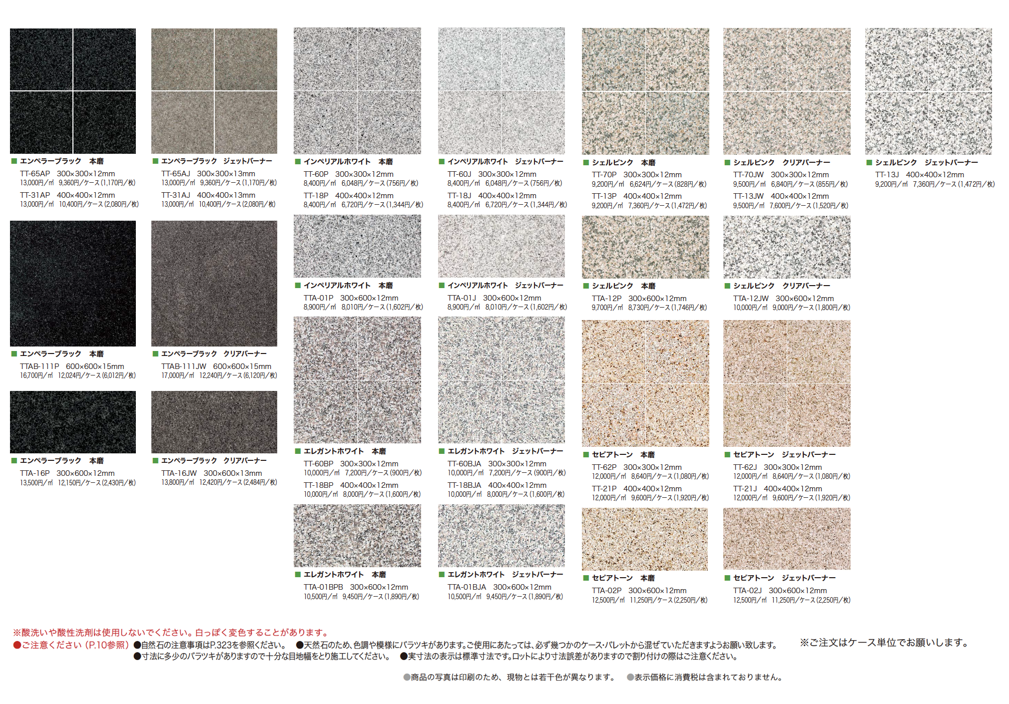 | カラー | エンペラーブラック 本磨 エンペラーブラック ジェットバーナー エンペラーブラック クリアバーナー インペリアルホワイト 本磨 インペリアルホワイト ジェットバーナー エレガントホワイト 本磨 エレガントホワイト ジェットバーナー シェルピンク 本磨 シェルピンク クリアバーナー シェルピンク ジェットバーナー セピアトーン 本磨 セピアトーン ジェットバーナー |
