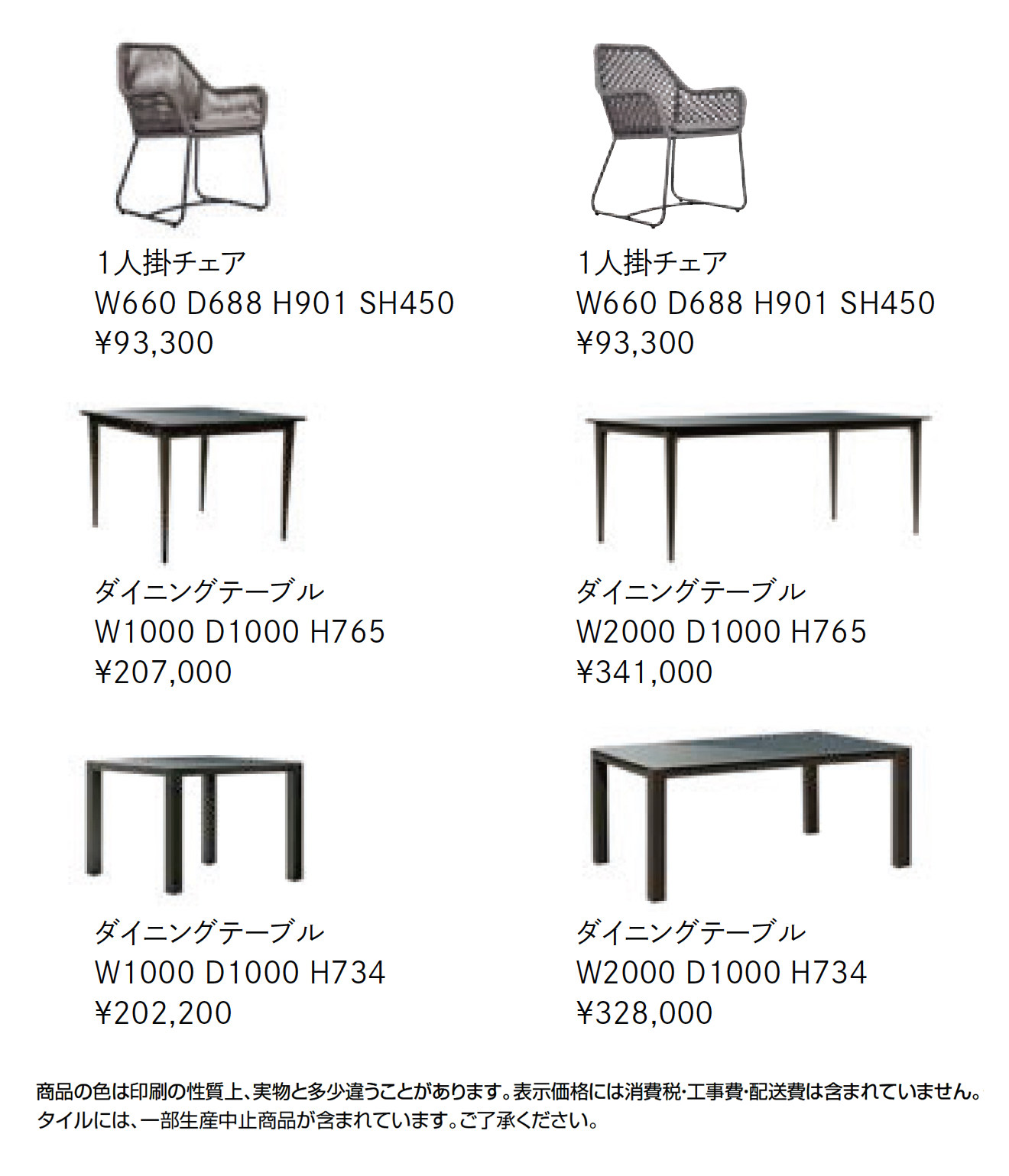 | 材質 | 人工ロープ(ポリエチレン) 人工ラタン(ポリエチレン) アルミニウム ポリウレタン アクリル ポリプロピレン 強化ガラス |