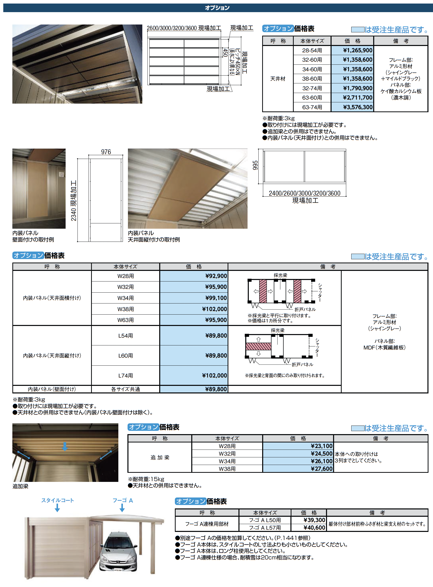 | 材質 | アルミ形材またはアルミ形材+ラッピング形材 スチールガルバリウム折板(ぺフ付き選択可能)+ポリカ折板 アルミ形材 スチール鋼板 アルミ形材+ポリカーボネート |