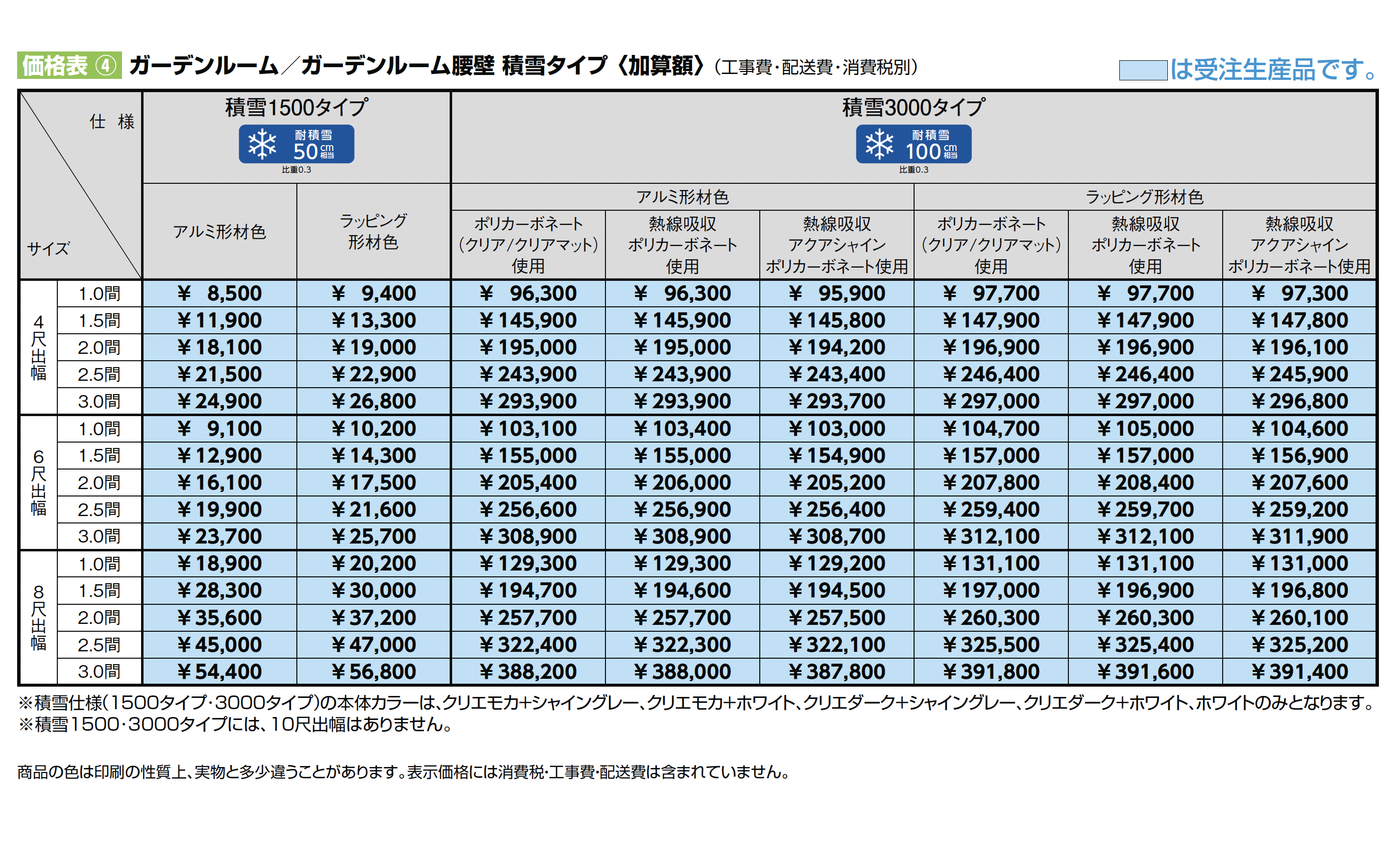 | 材質 | アルミ形材またはアルミ形材+ラッピングアルミ形材 ポリカーボネート板 t=2.0mm 熱線吸収ポリカーボネート板 t=2.0mm 熱線吸収アクアシャインポリカーボネート板 t=2.0mm ポリカーボネート板 t=5.0mm 強化ガラス t=5.0mm 熱処理ガラス t=5.0mm ポリカーボネート板 t=3.0mm フロート板ガラス t=3.0mm |