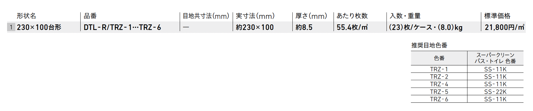 | カラー | TRZ-1 TRZ-2 TRZ-4 TRZ-5 TRZ-6 |