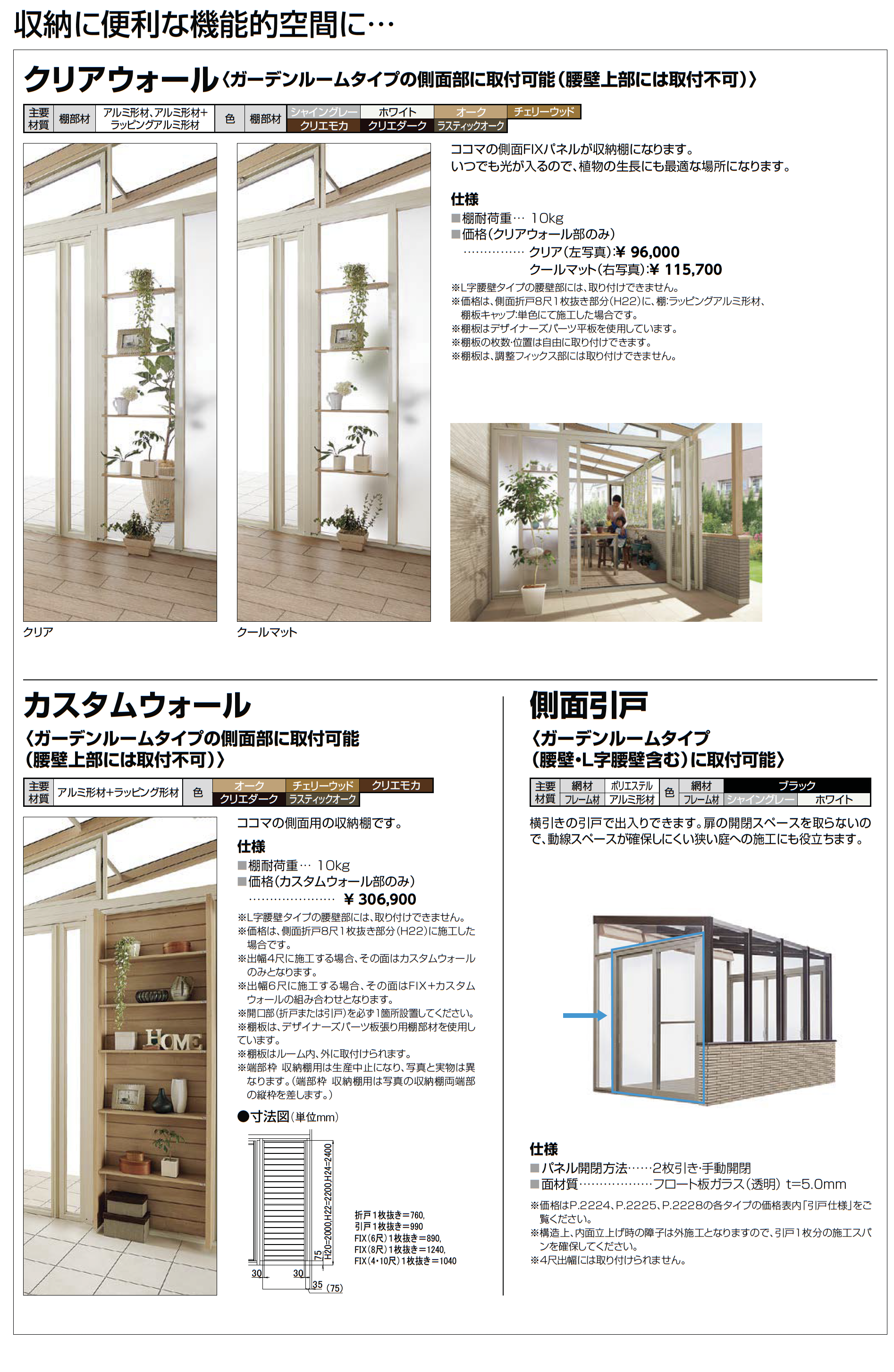 | 材質 | アルミ形材またはアルミ形材+ラッピングアルミ形材 ポリカーボネート板 t=2.0mm 熱線吸収ポリカーボネート板 t=2.0mm 熱線吸収アクアシャインポリカーボネート板 t=2.0mm ポリカーボネート板 t=5.0mm 強化ガラス t=5.0mm 熱処理ガラス t=5.0mm ポリカーボネート板 t=3.0mm フロート板ガラス t=3.0mm |