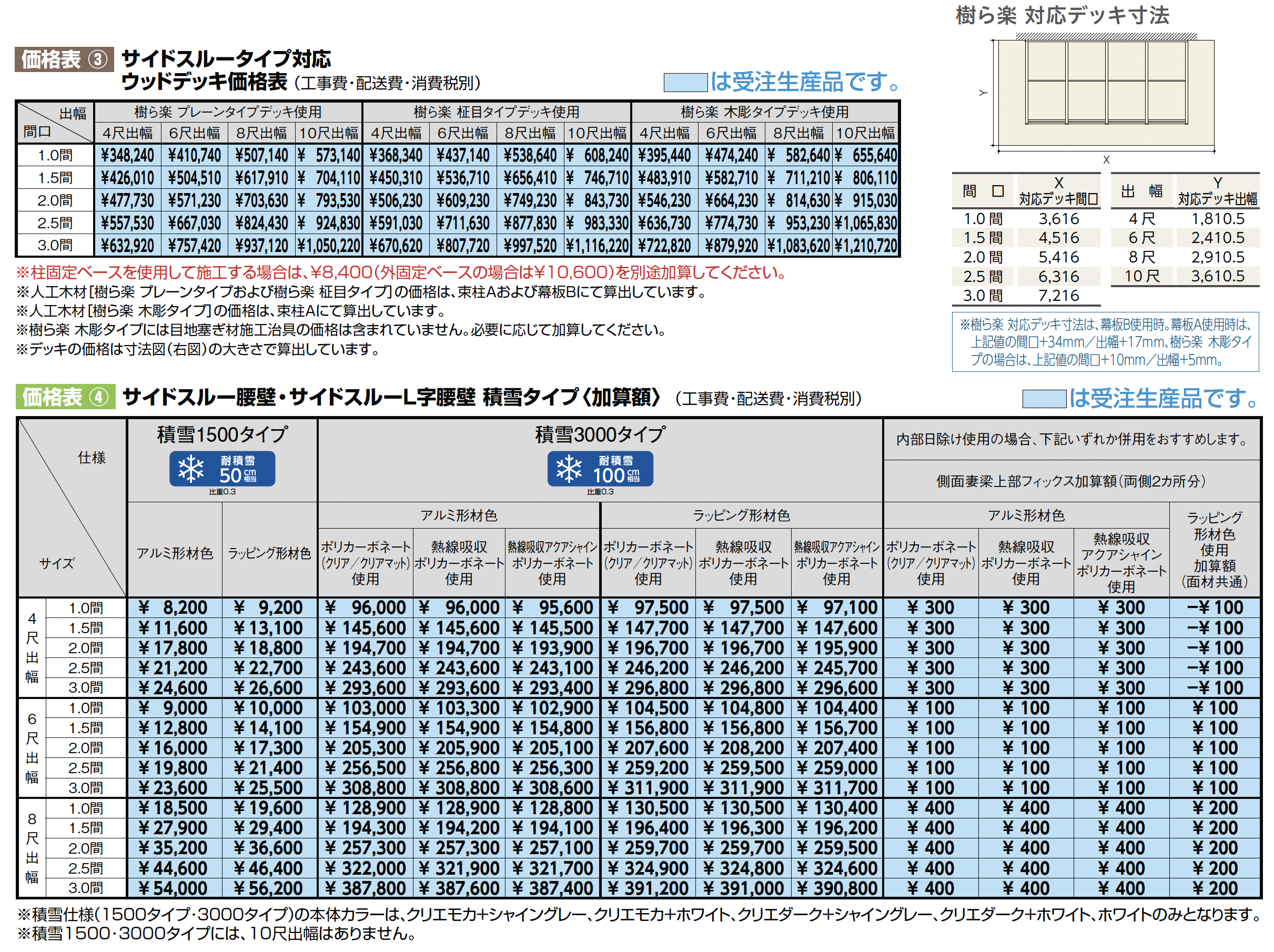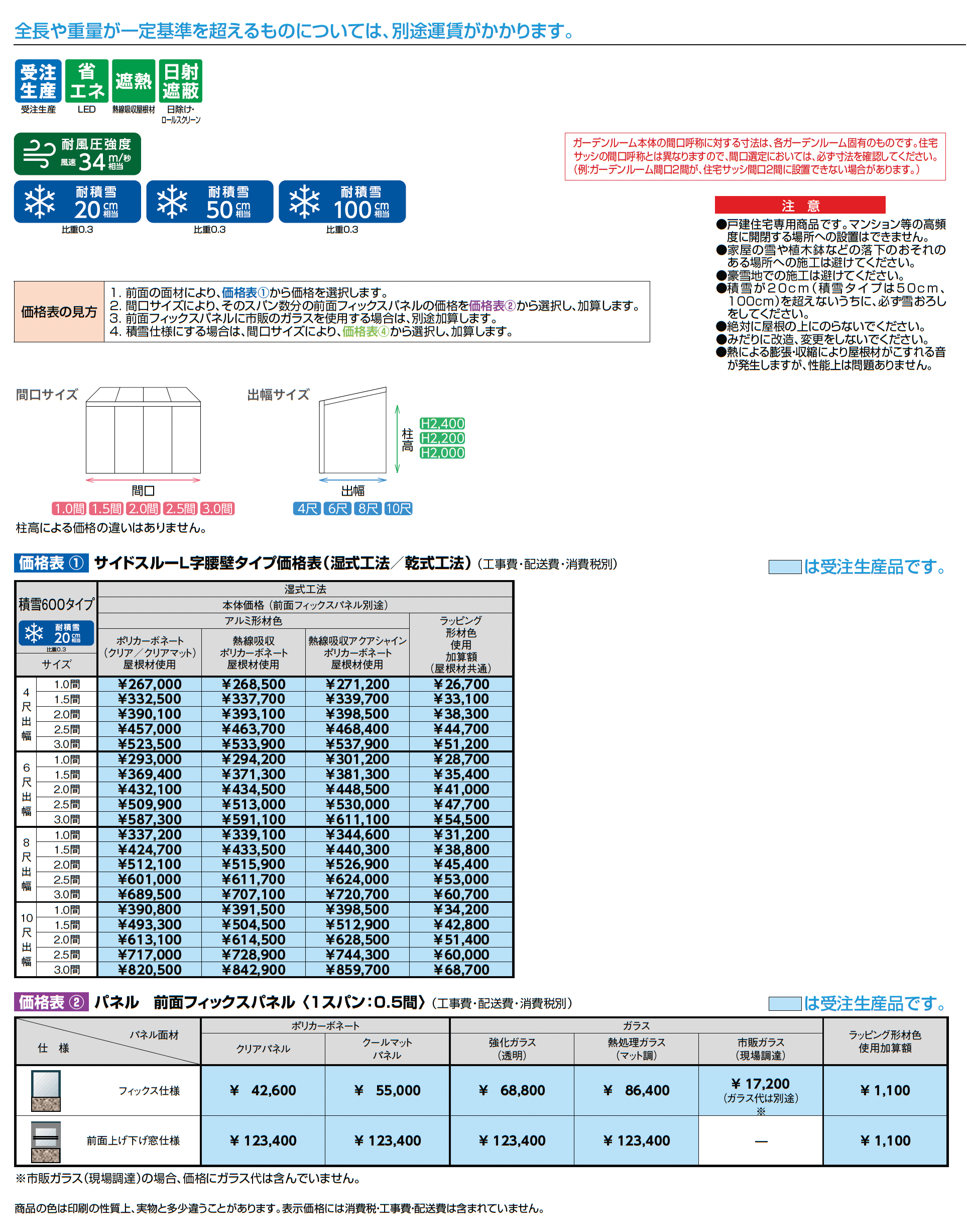 | 材質 | アルミ形材またはアルミ形材+ラッピングアルミ形材 ポリカーボネート板 t=2.0mm 熱線吸収ポリカーボネート板 t=2.0mm 熱線吸収アクアシャインポリカーボネート板 t=2.0mm ポリカーボネート板 t=5.0mm 強化ガラス t=5.0mm 熱処理ガラス t=5.0mm |