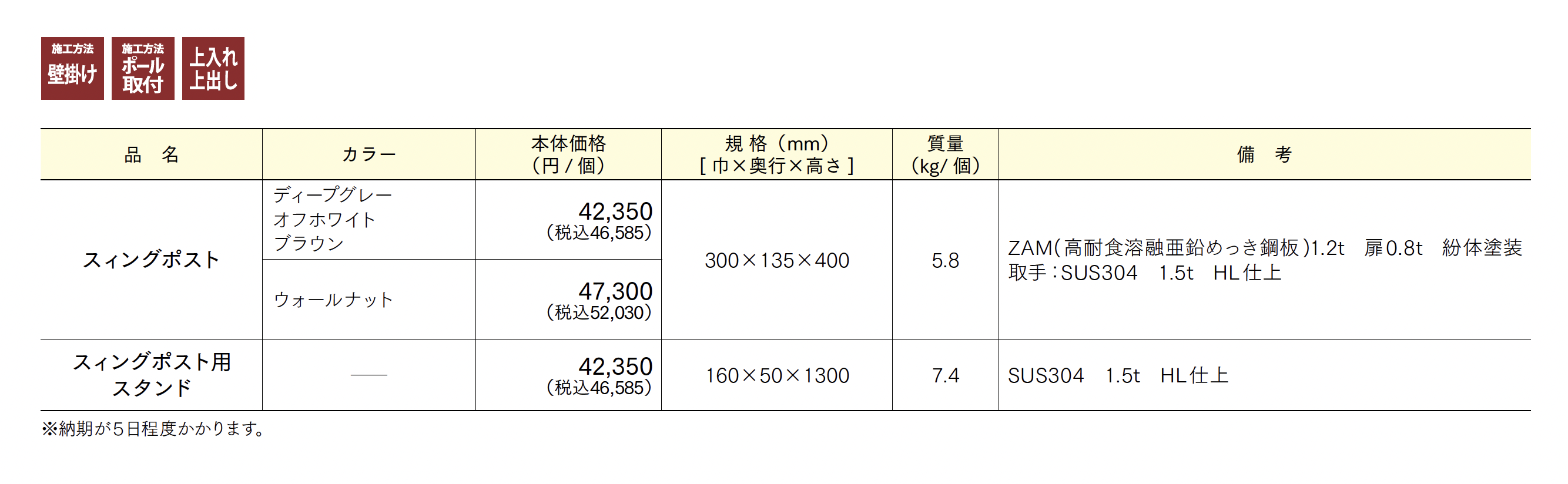 | 標準納期 | 5日程度 |