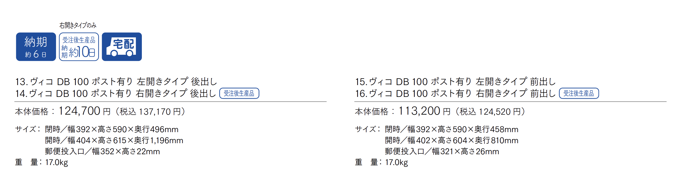 | 標準納期 | 約6日/受注後生産品約10日(右開きタイプのみ) |